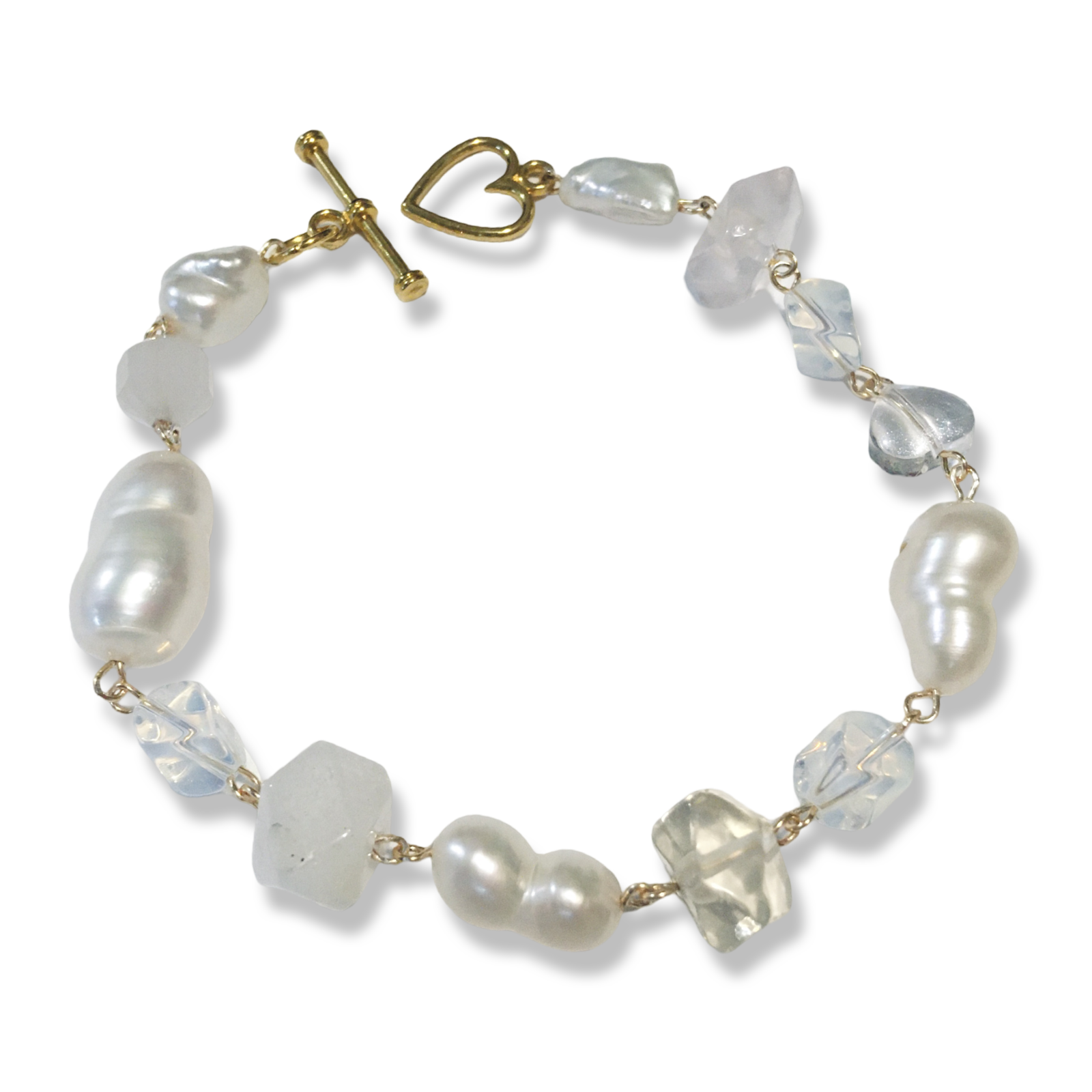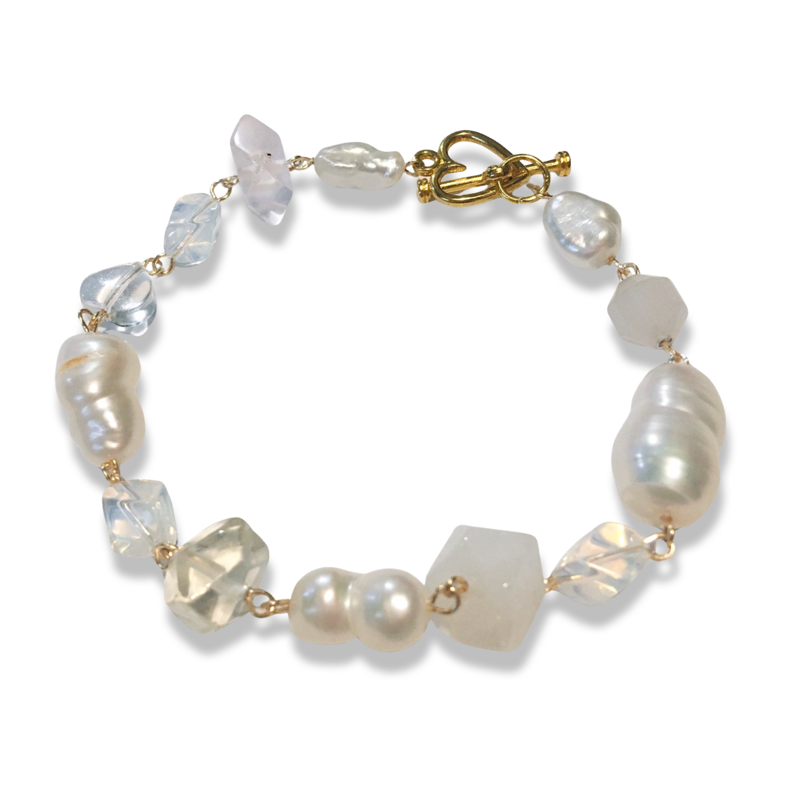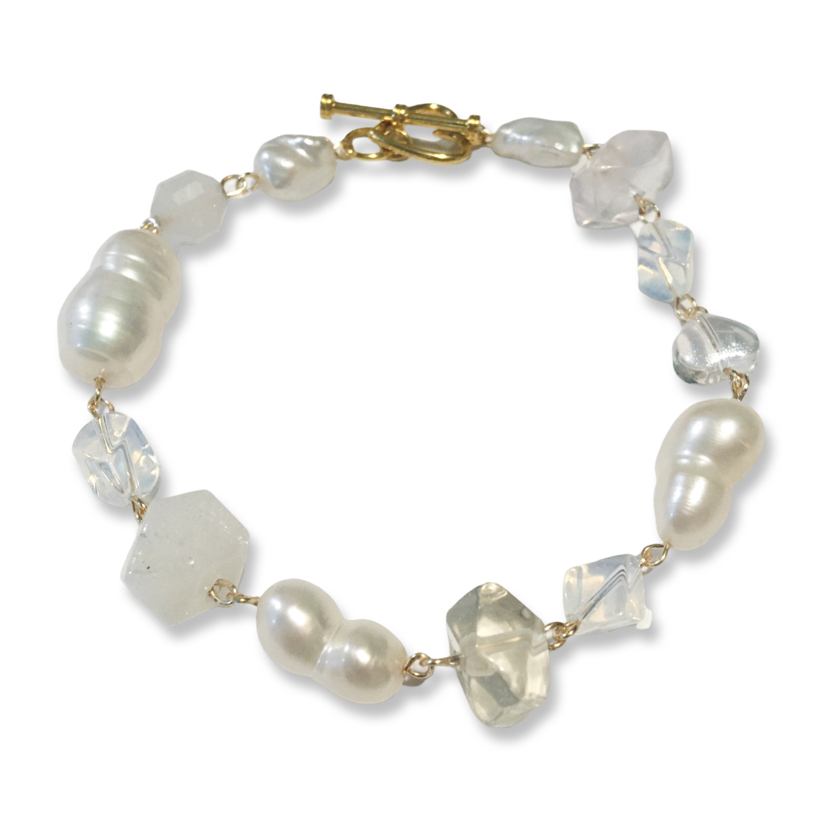 A 7" bracelet featuring freshwater pearls and twin-pearls, and accents of glass and semiprecious beads sourced from small local businesses. Free US shipping!