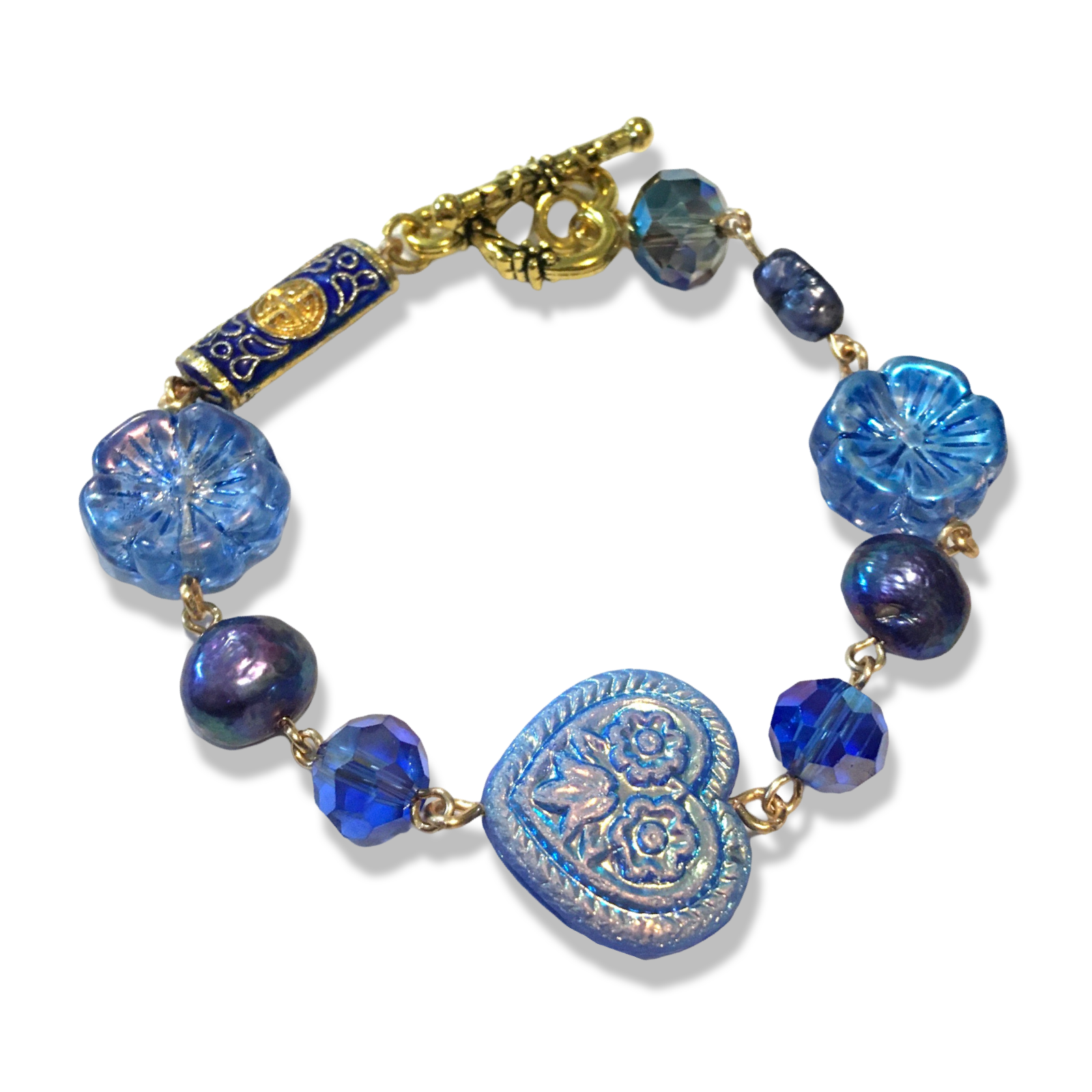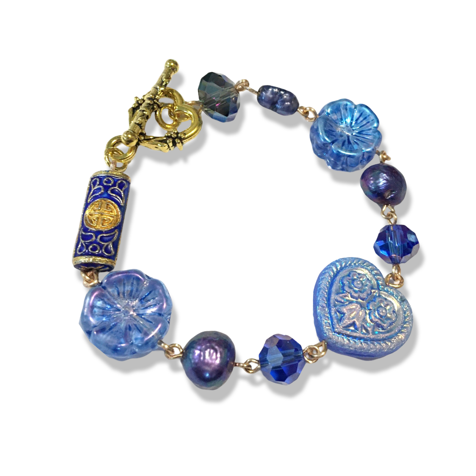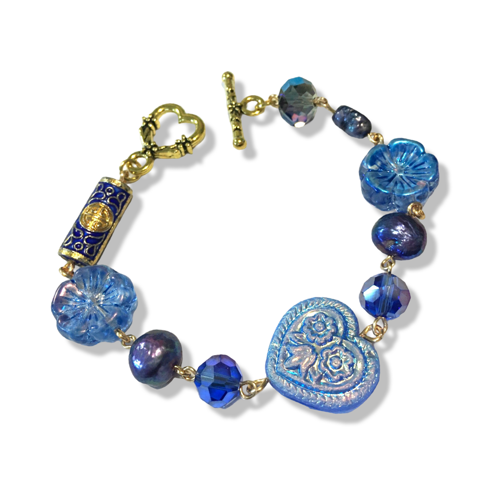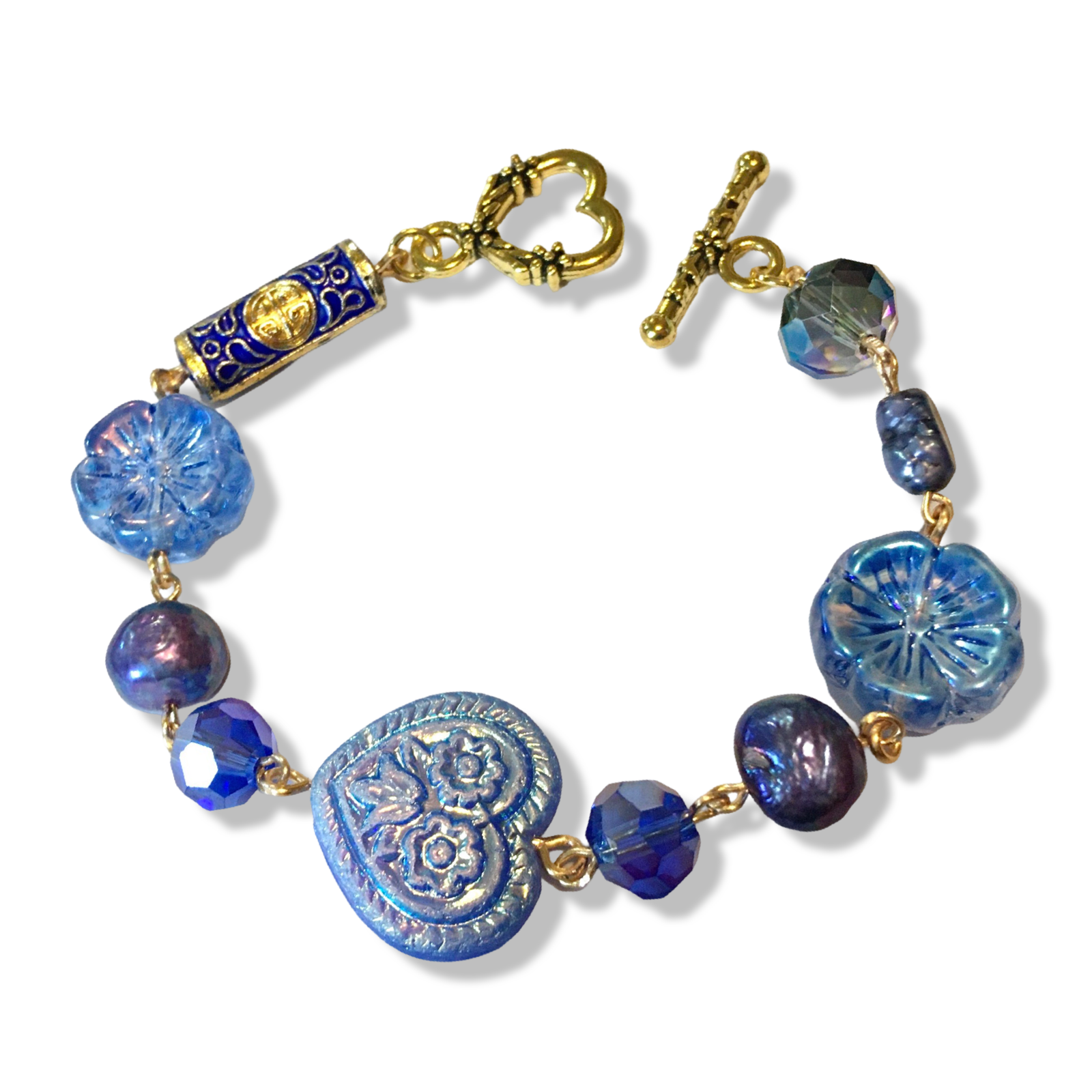 A handmade bracelet featuring assorted Czech glass beads, iridescent flowers, a vintage frosted glass heart, iris freshwater pearls, and a Cloisonné bead in royal blue. I find it so bright and beautiful!