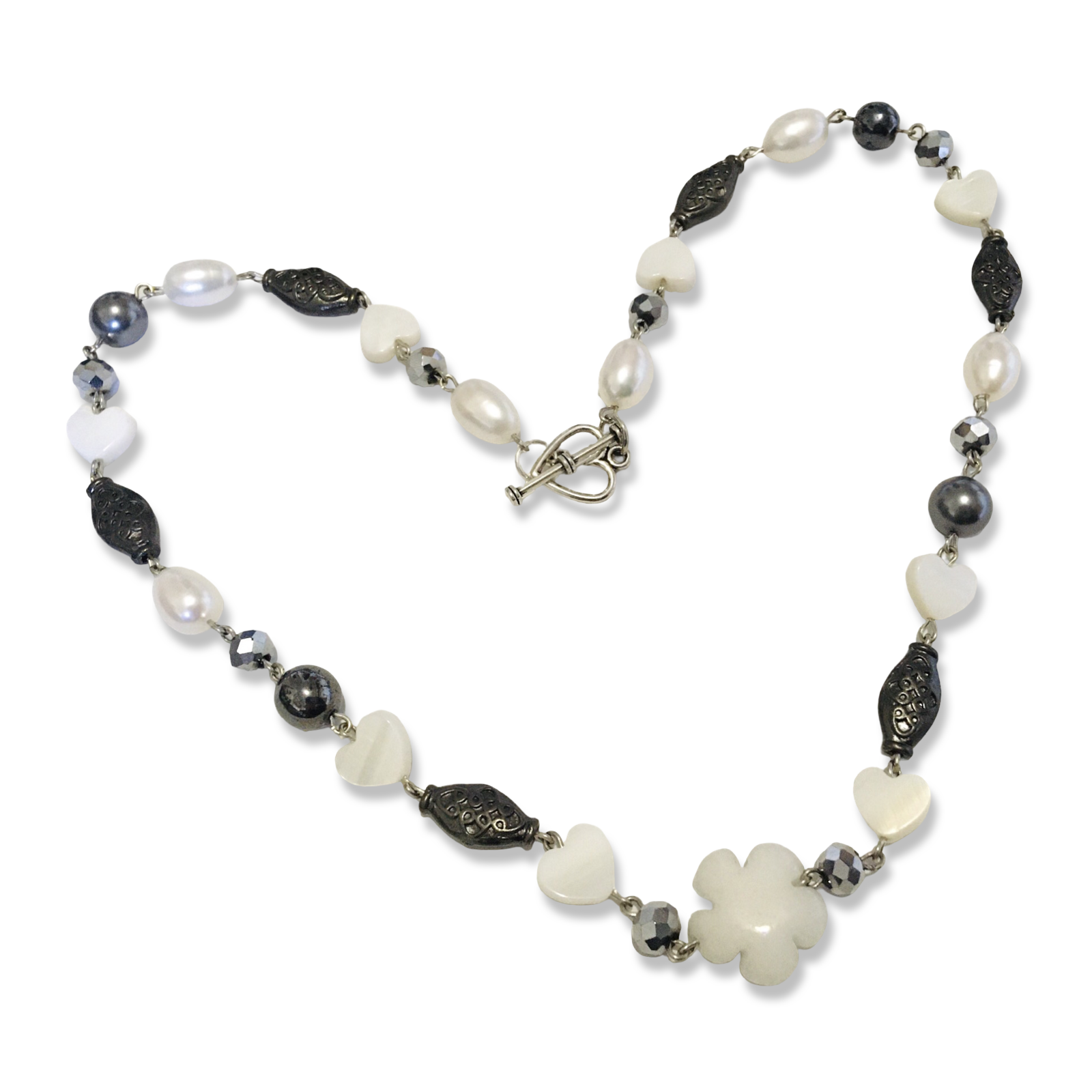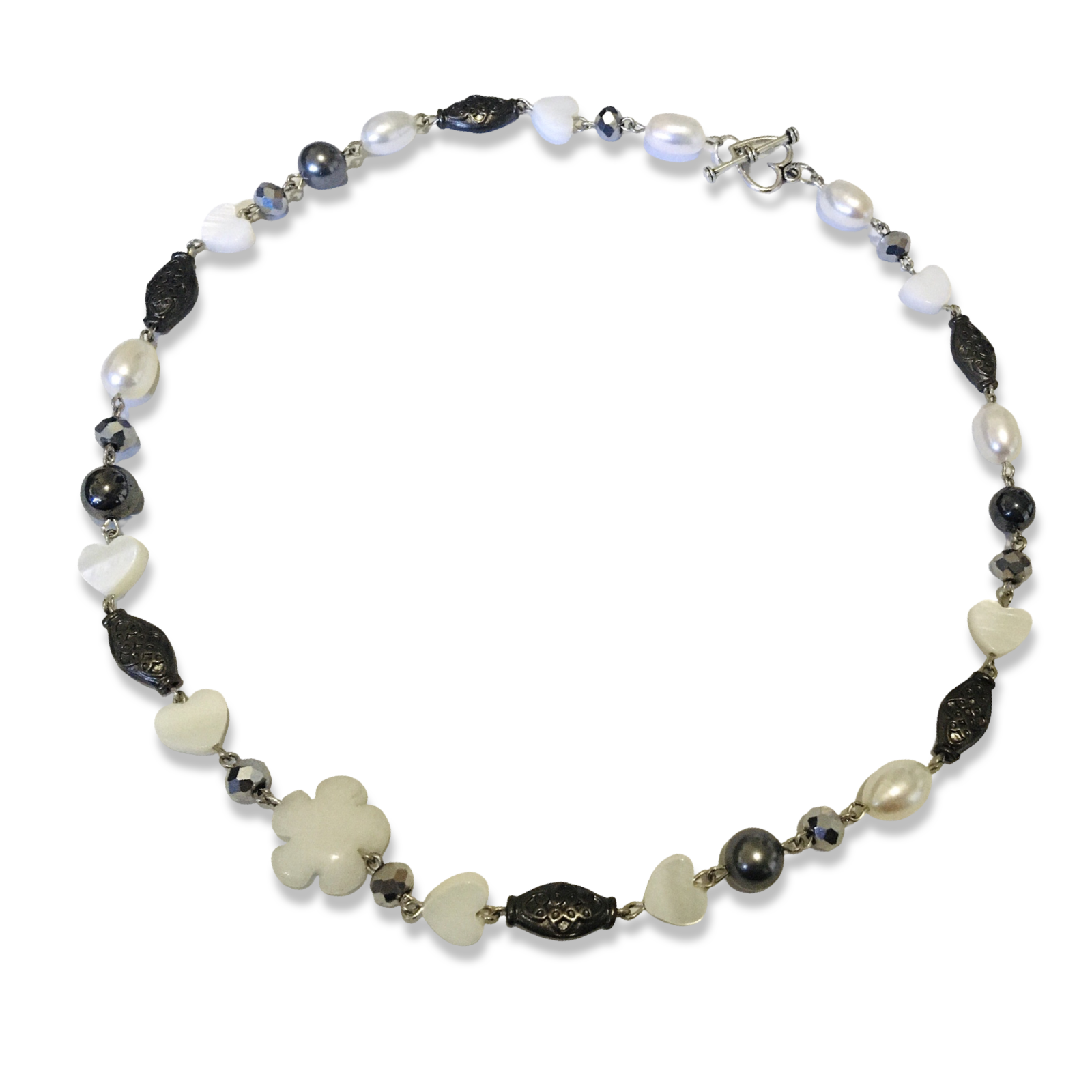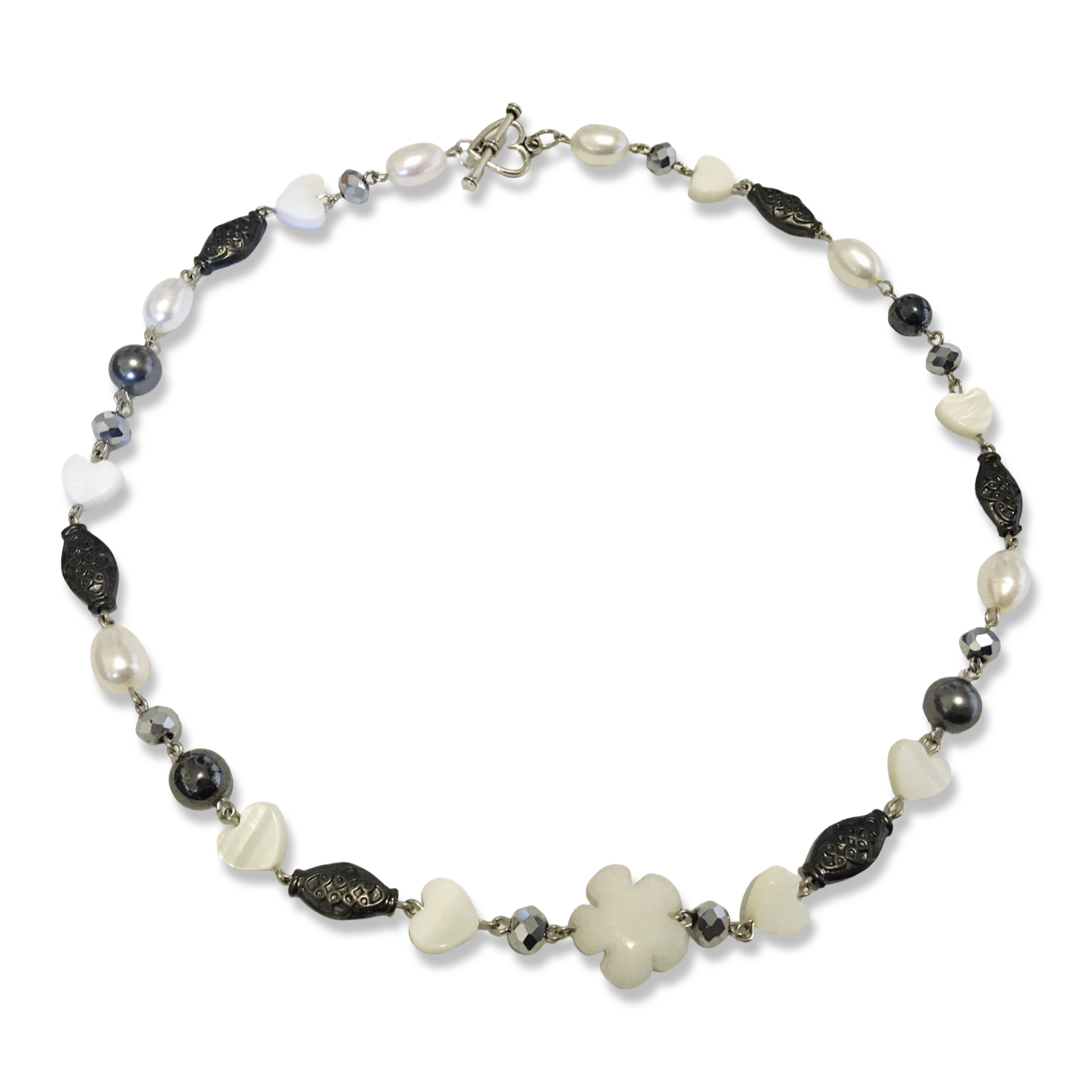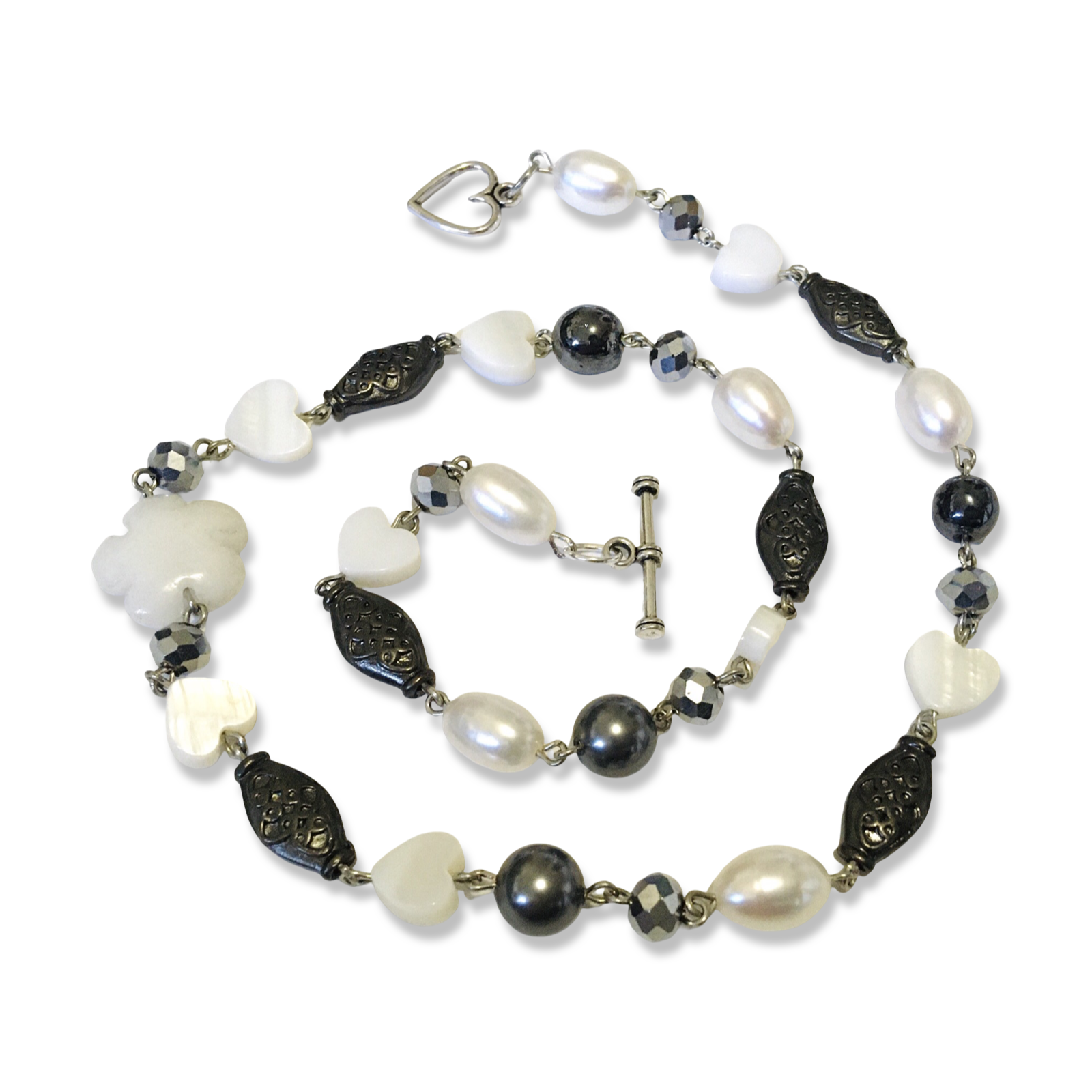 A handmade black & white necklace featuring a mix of glass and stone beads, shell hearts, freshwater pearls, and gunmetal.