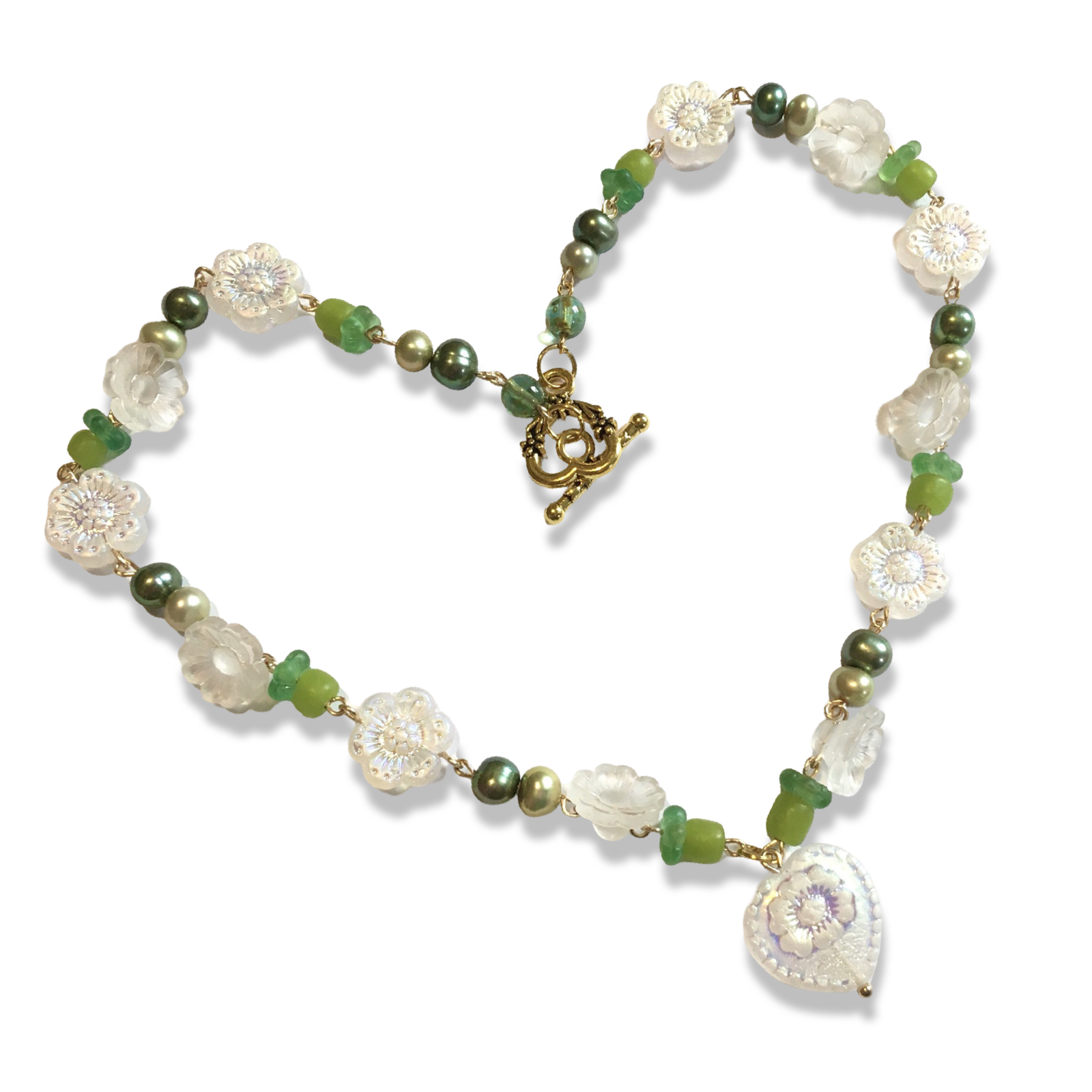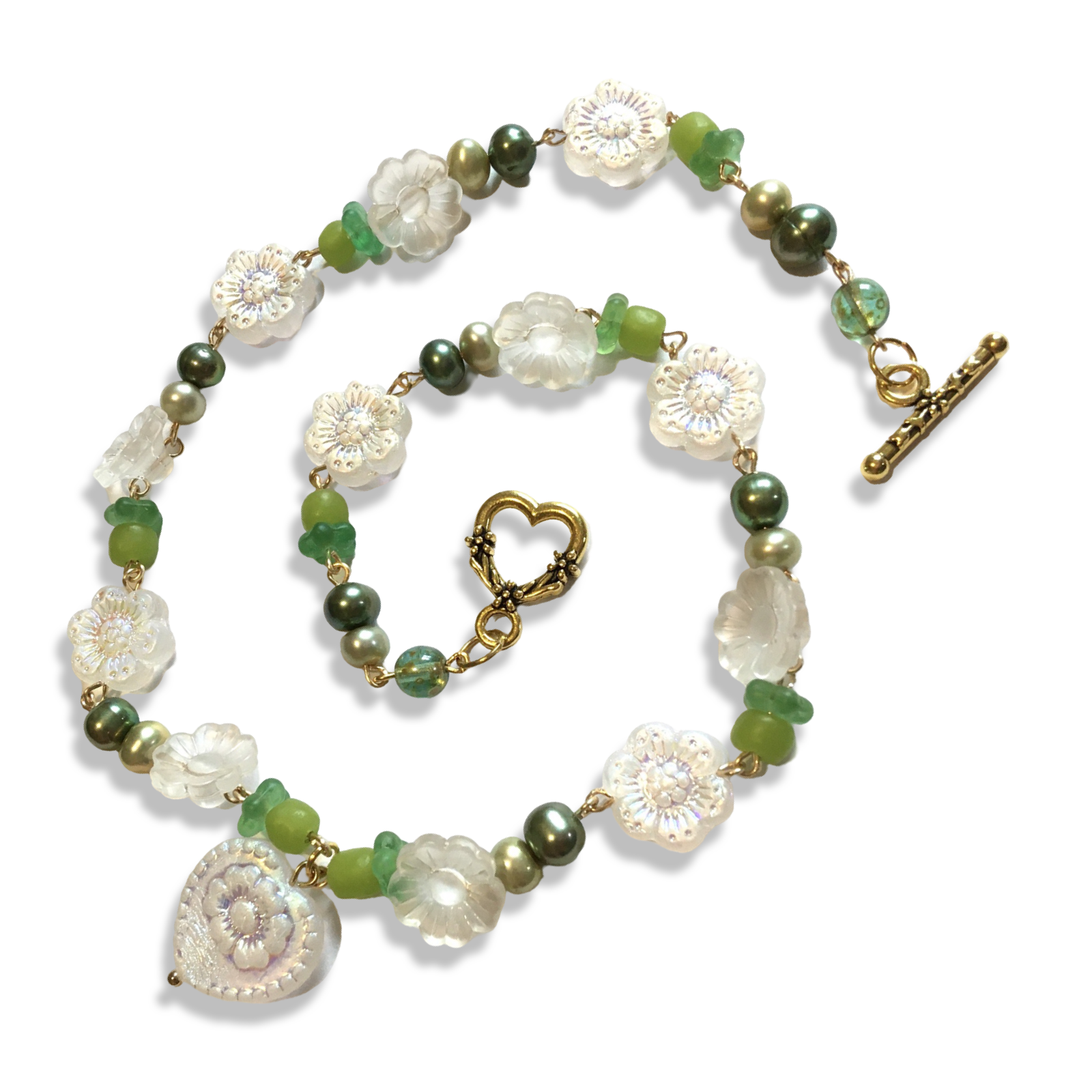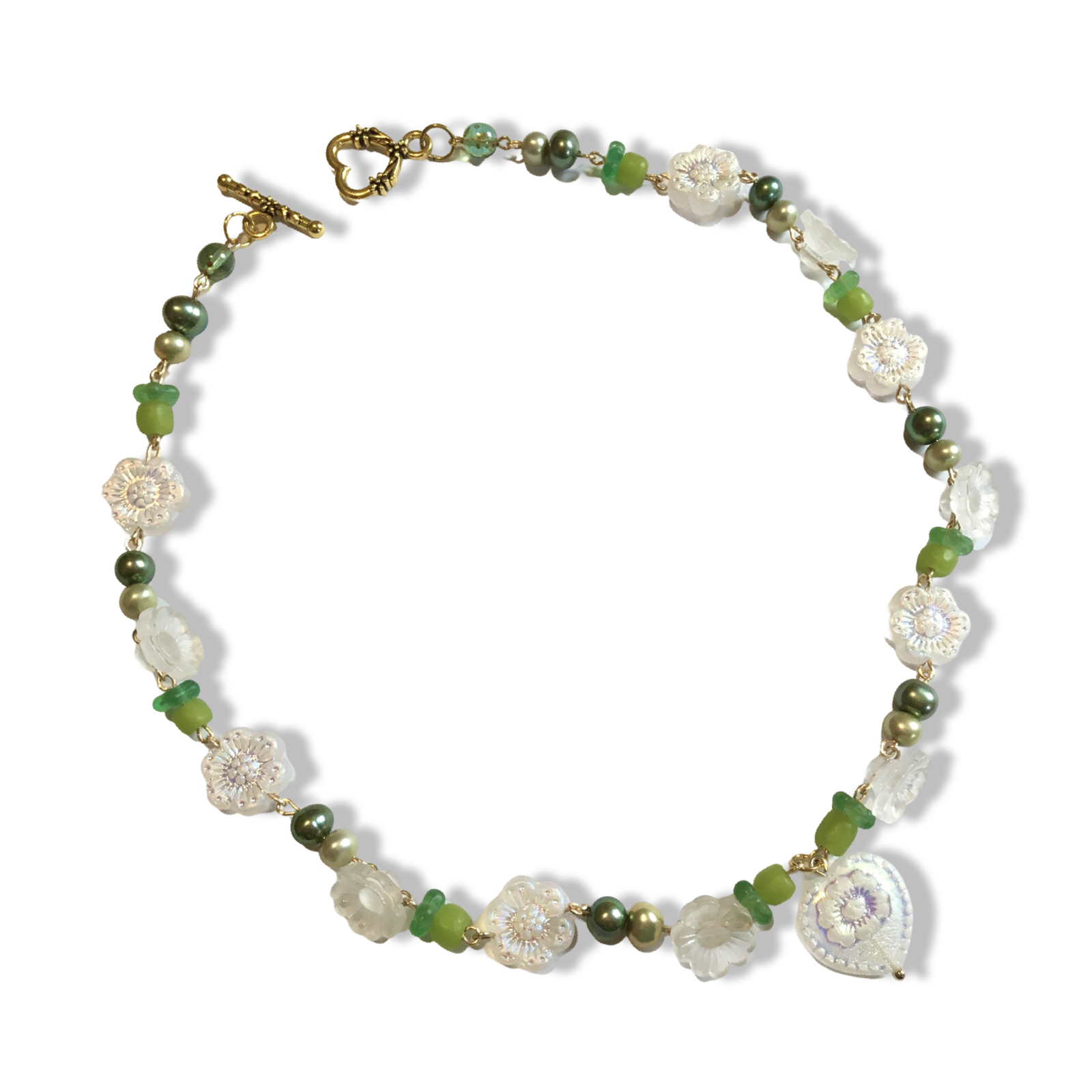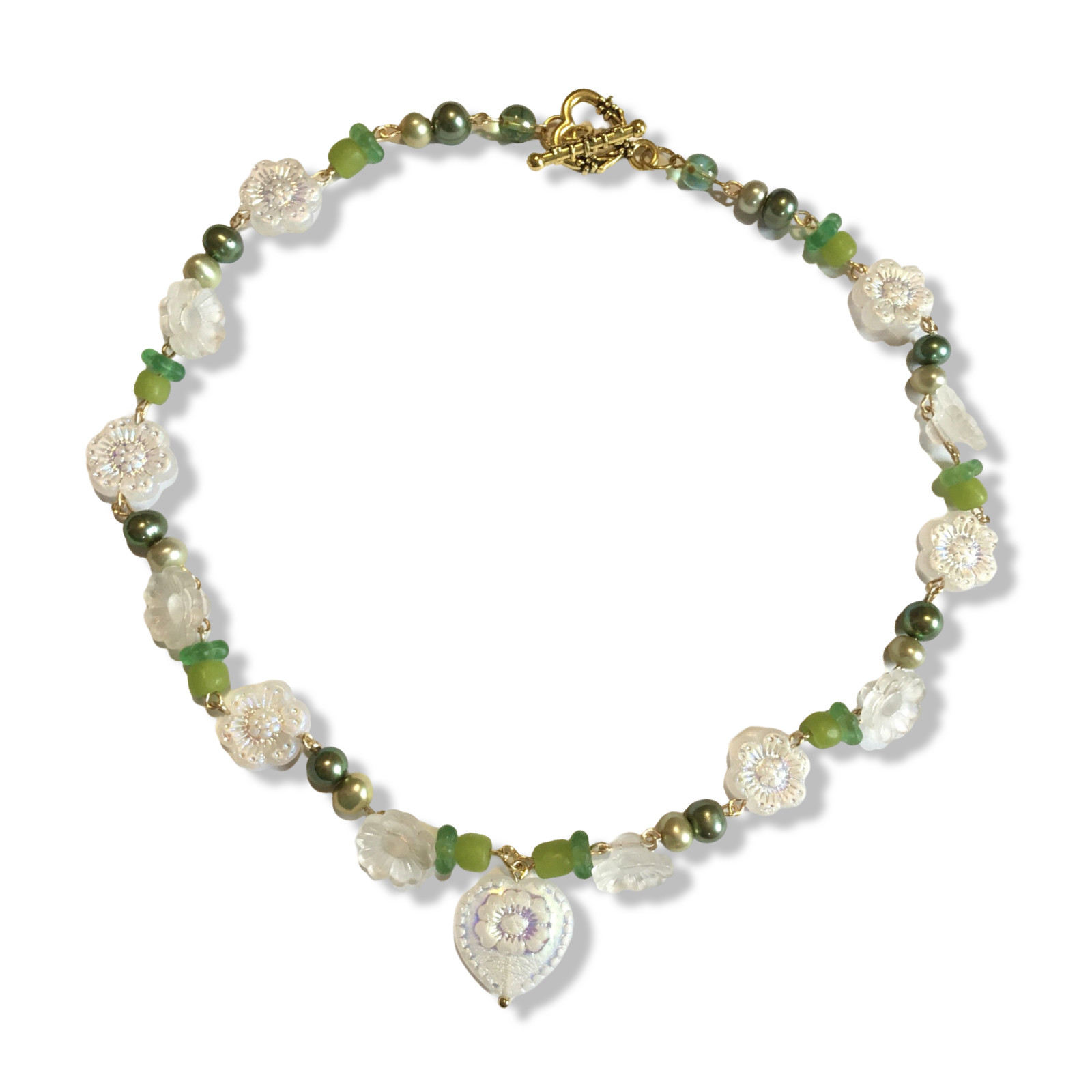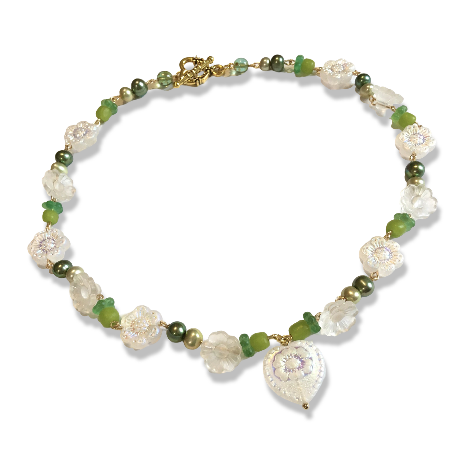 A sweet handmade necklace featuring green freshwater pearls, recycled Java beads, salvaged vintage acrylic flowers, Czech glass daisies in an iridescent powder white, with a heart to match.