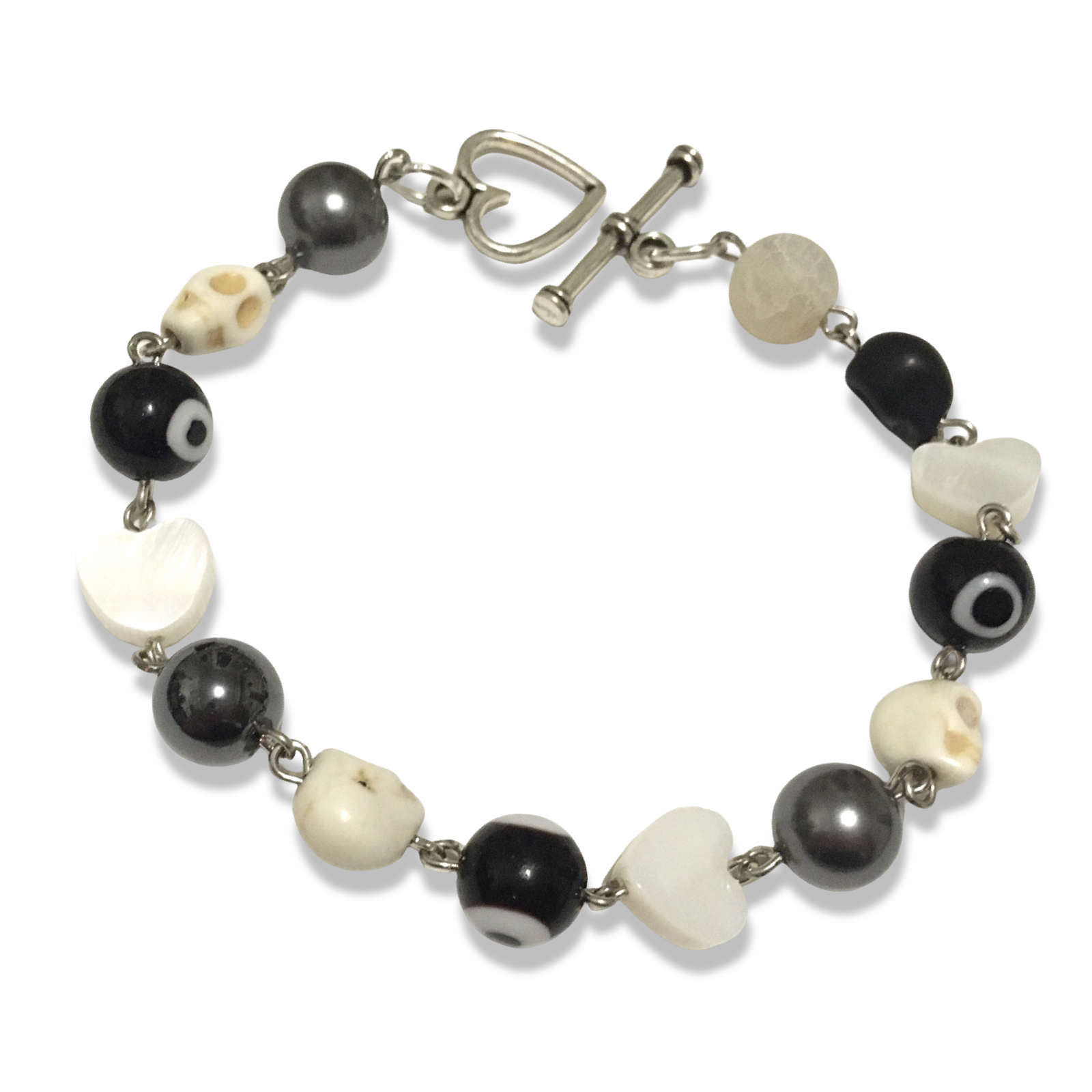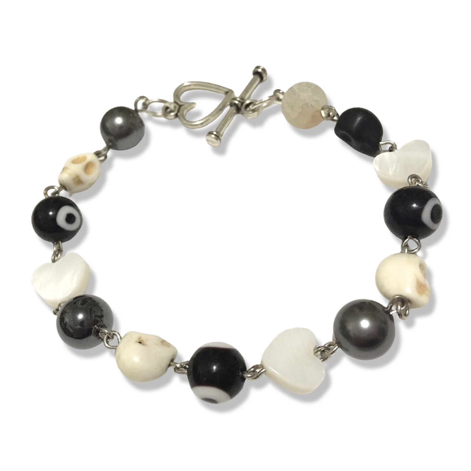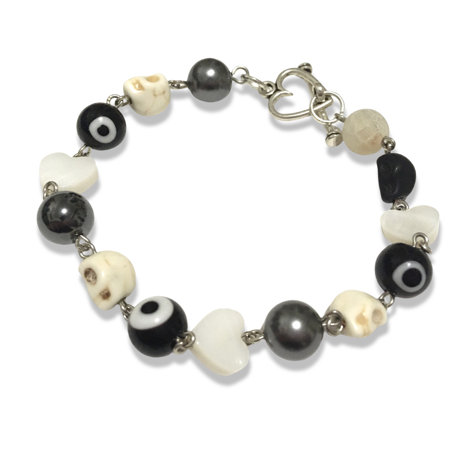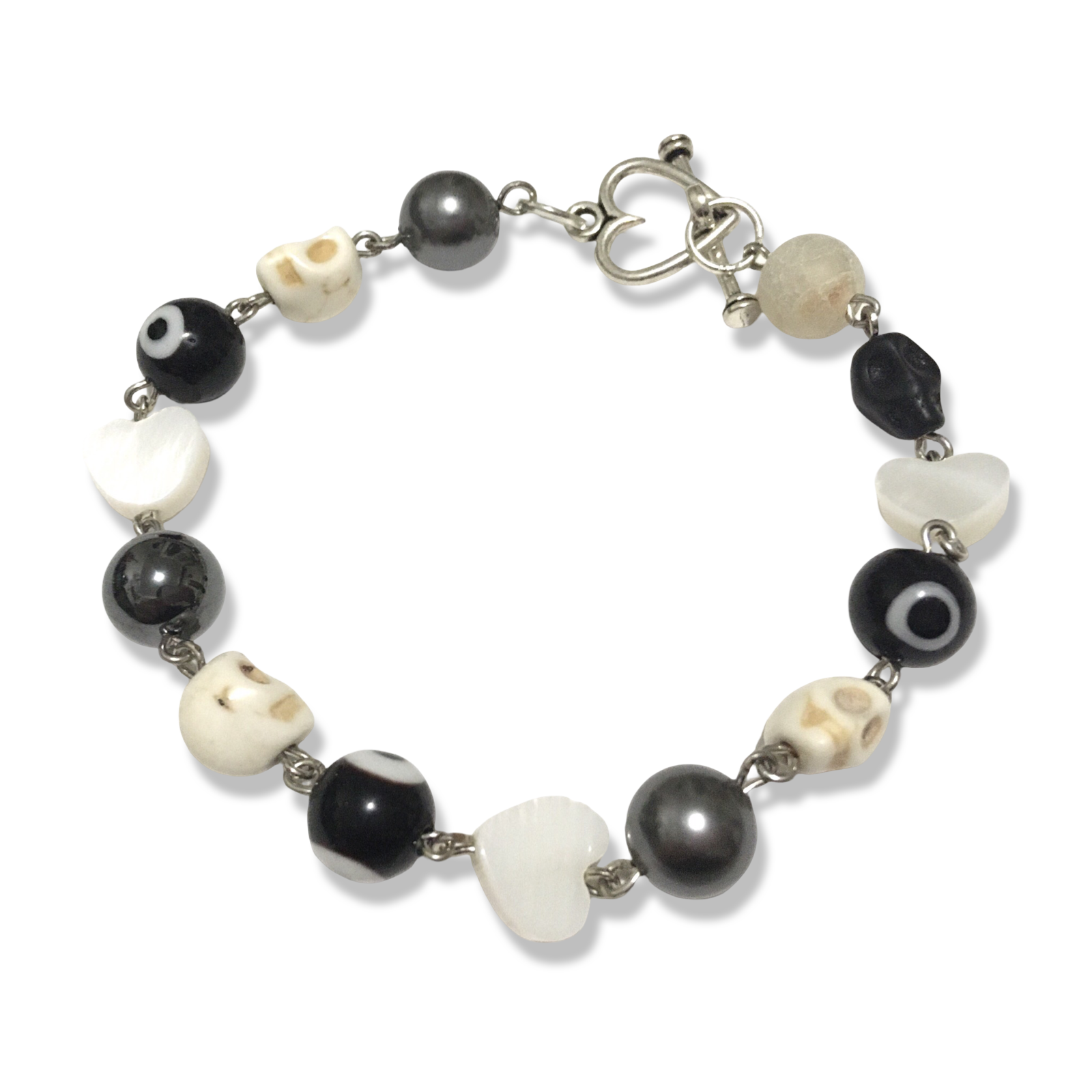 A handmade black & white bracelet featuring a mix of shell hearts, magnesite skulls, agate, Swarovski glass 'pearls', and glass evil eyes.