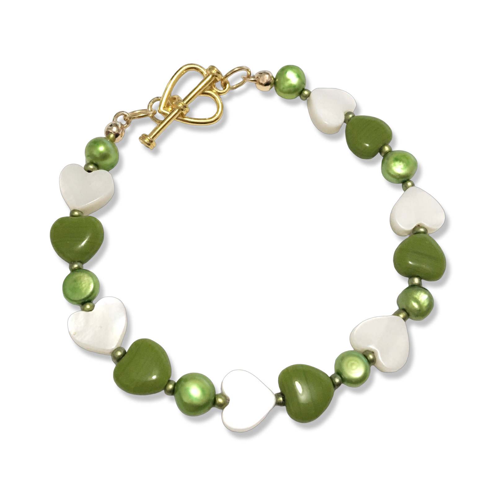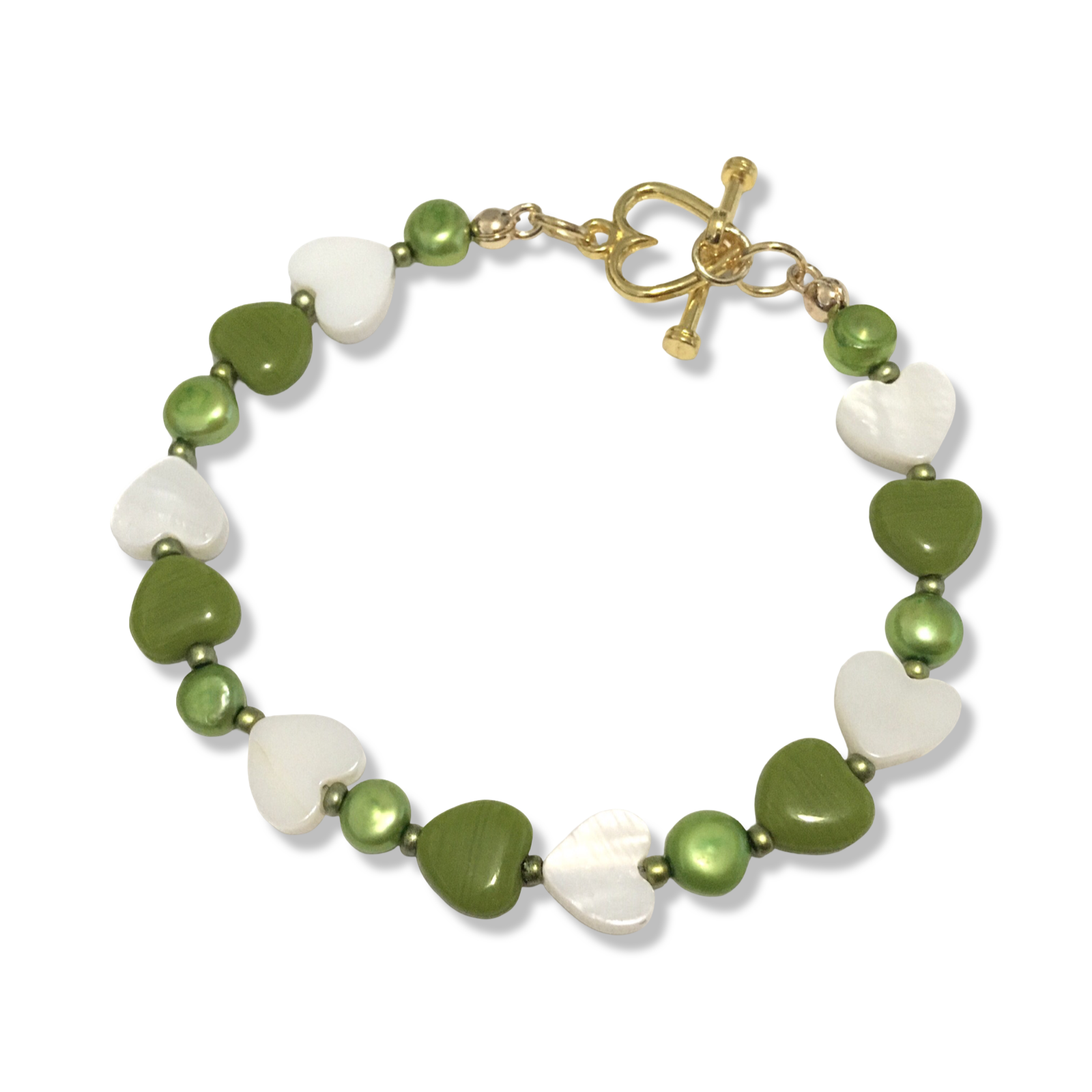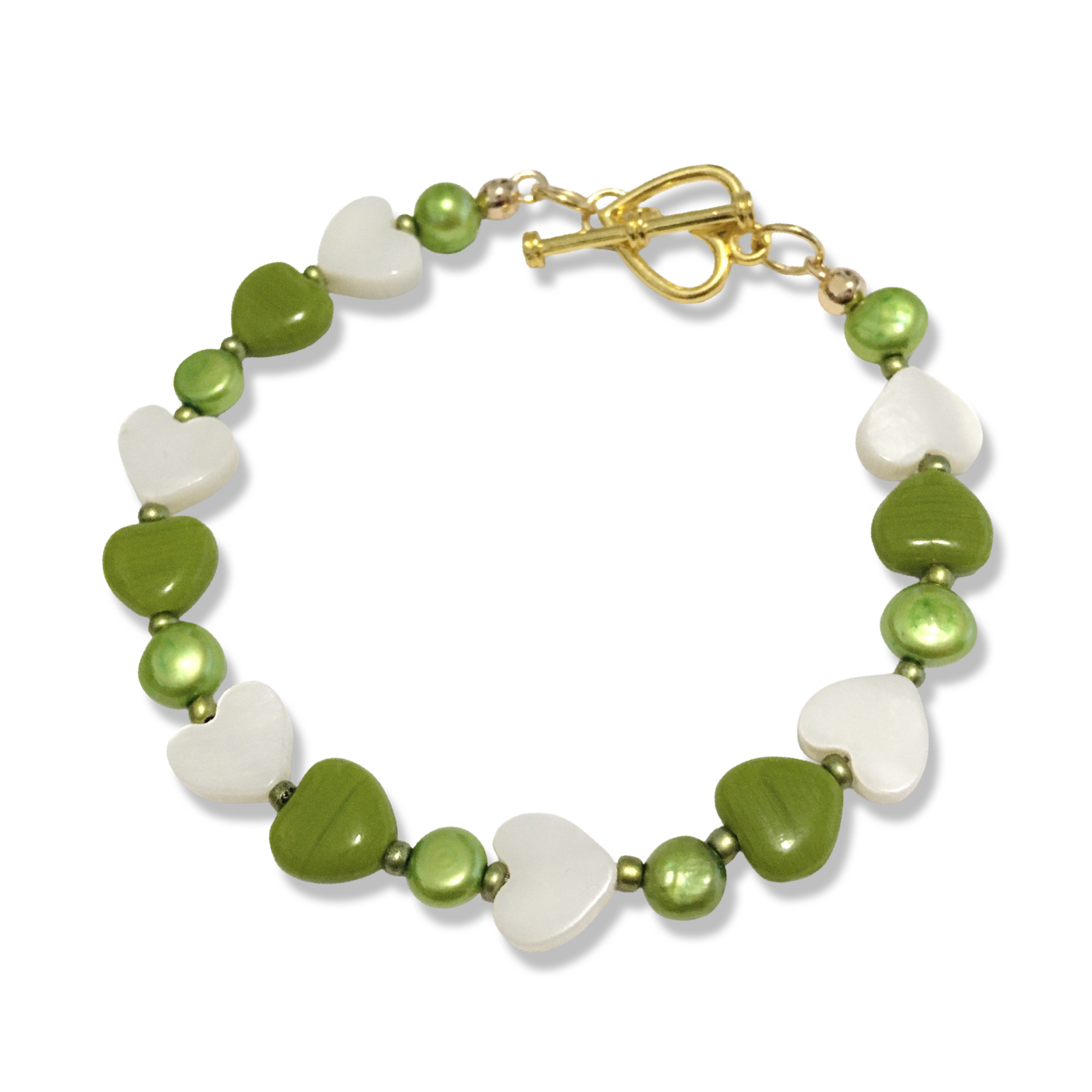 A sweet handmade bracelet featuring a string of shell hearts, matcha glass hearts, and grass green freshwater pearls.