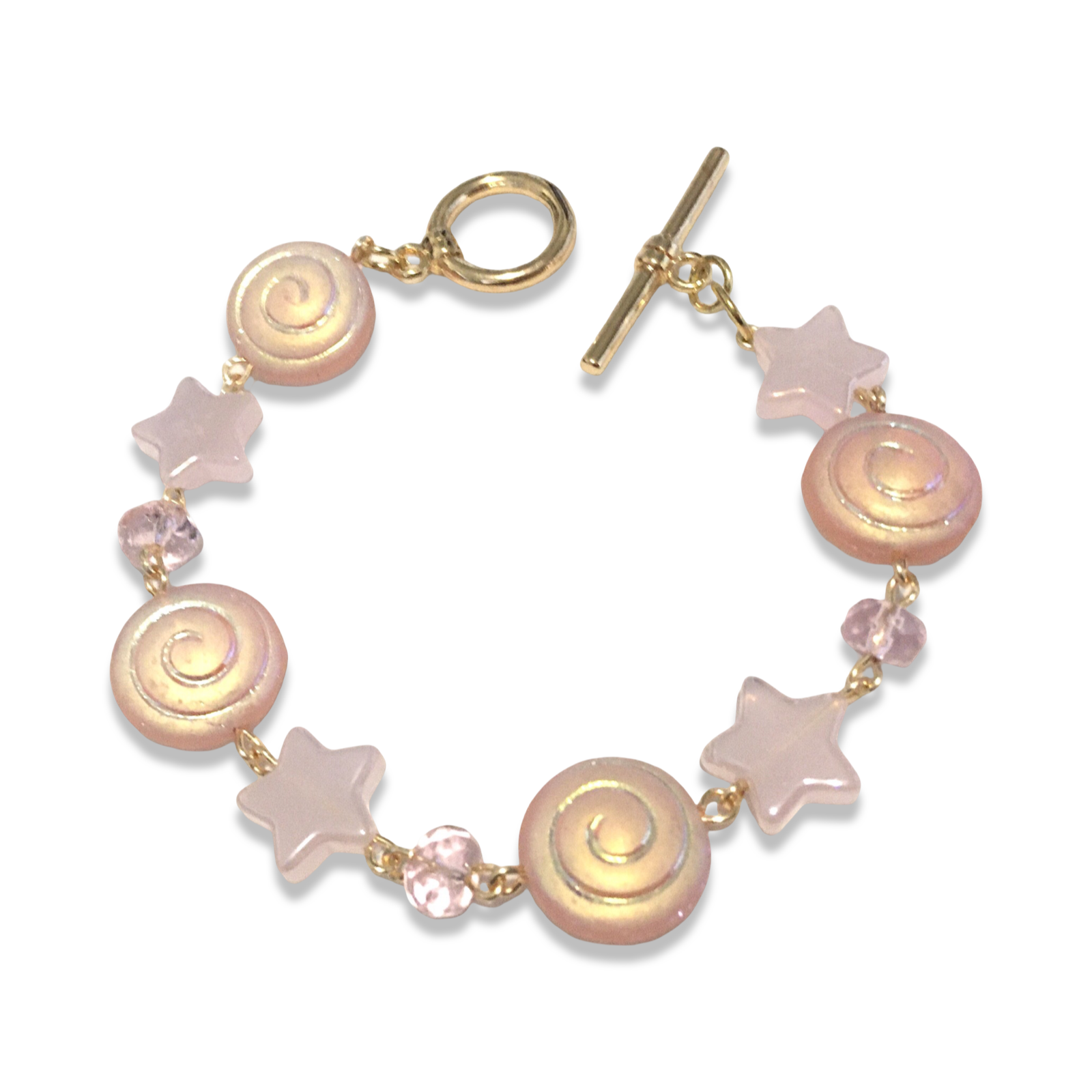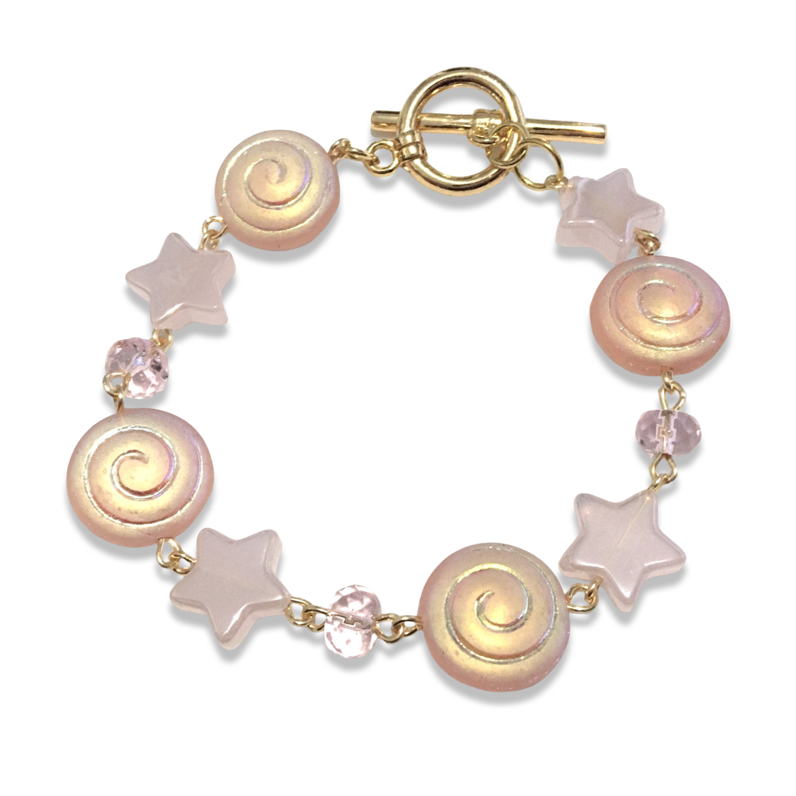 A simple bracelet in baby pinks, featuring Czech glass stars and spiral coins.