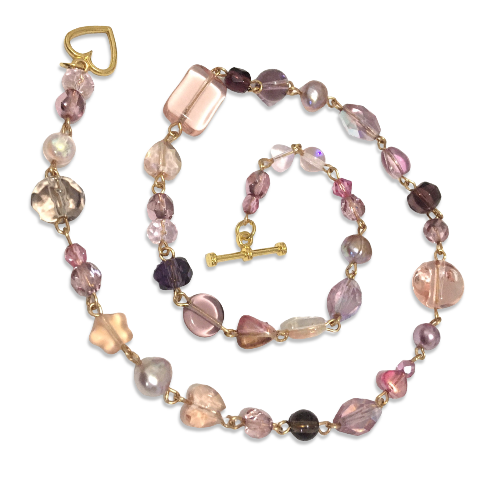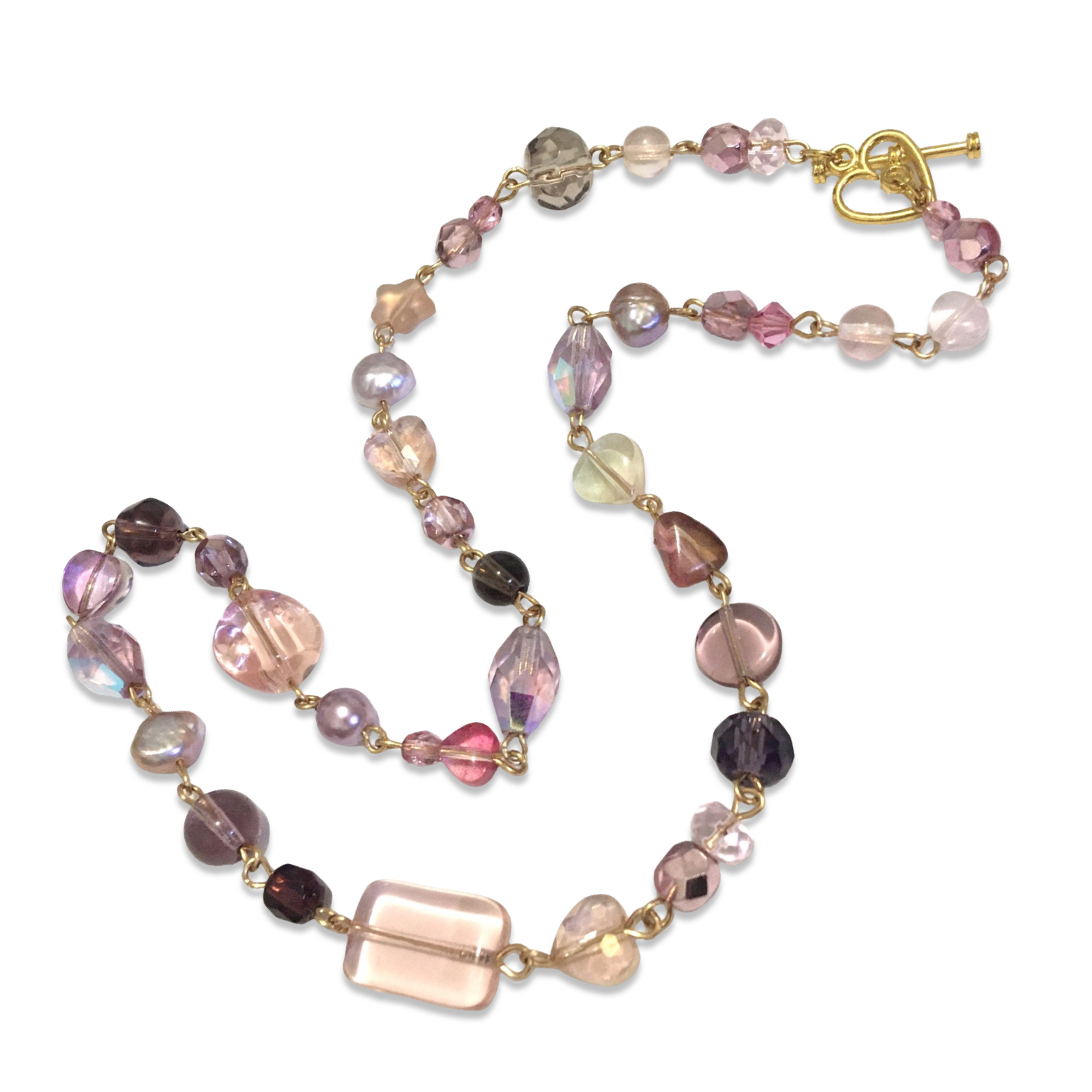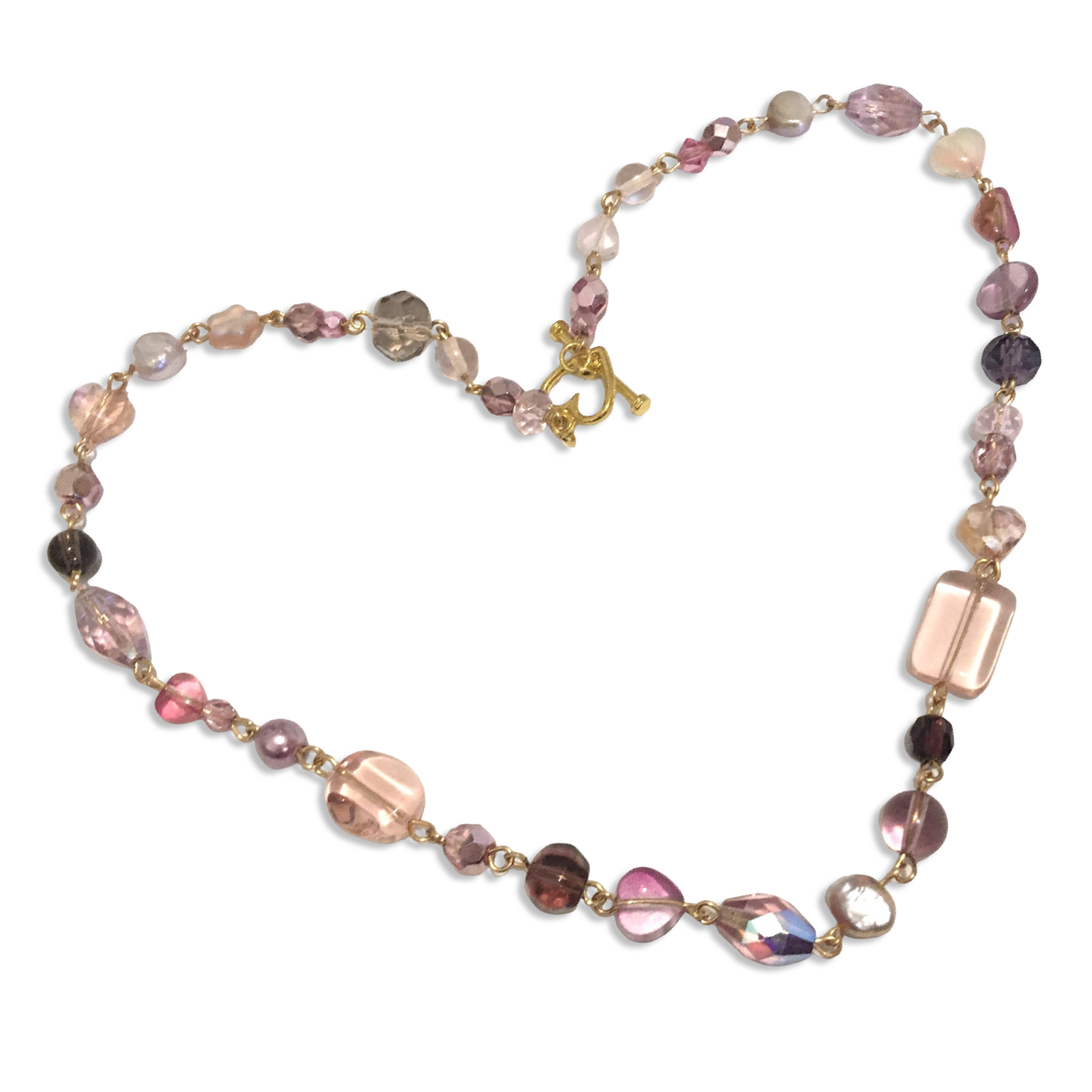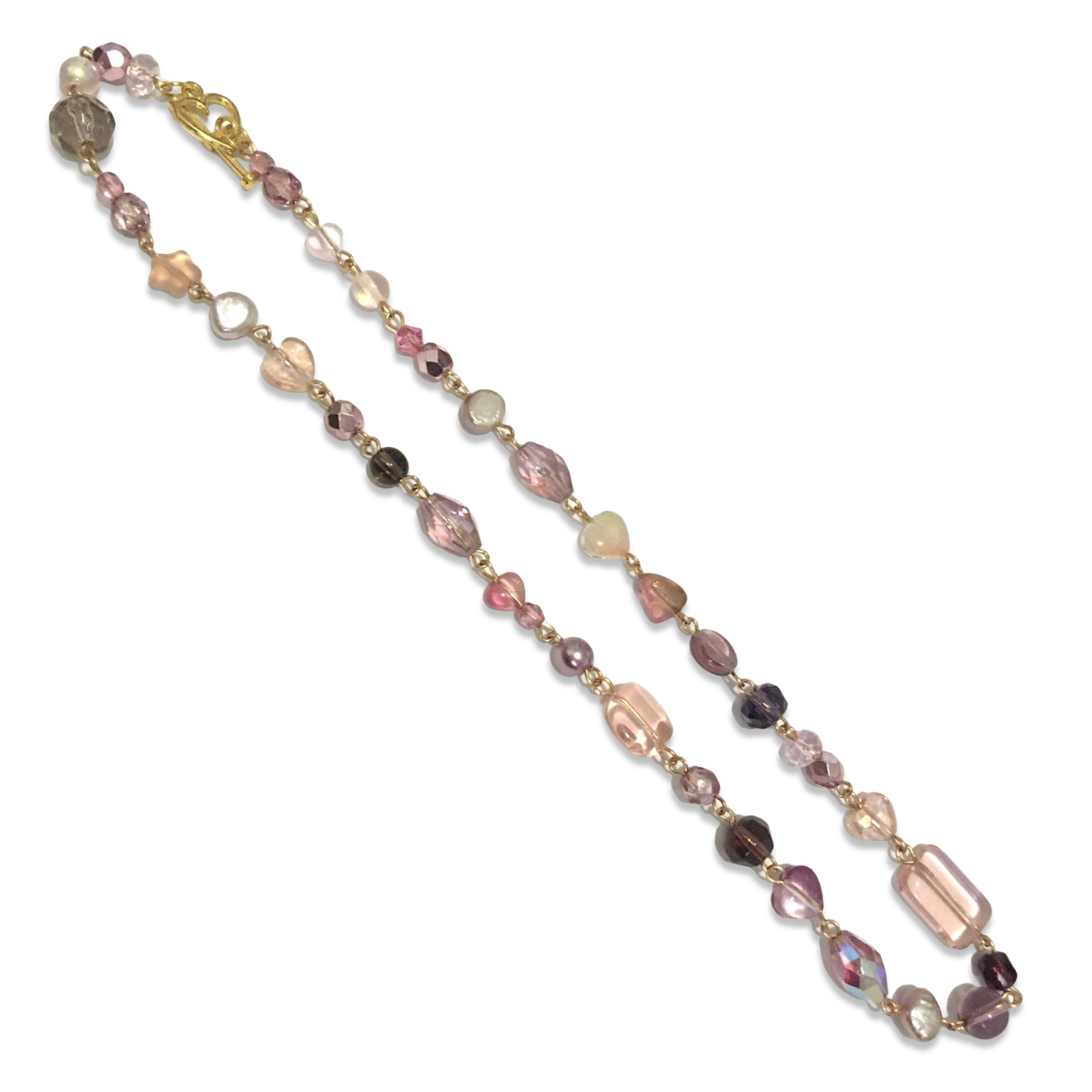 A prismatic handmade necklace featuring an assortment of Czech glass beads and rose freshwater pearls.