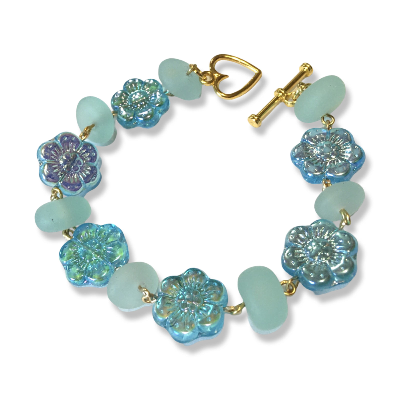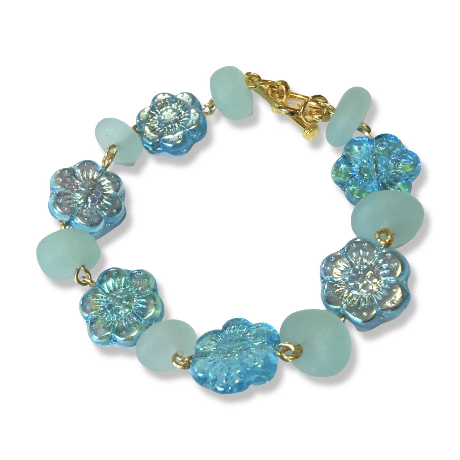 A handmade bracelet featuring blue sea glass and iridescent Czech glass flowers. I was thinking about Hiroshi Nagai illustrations while I made it...