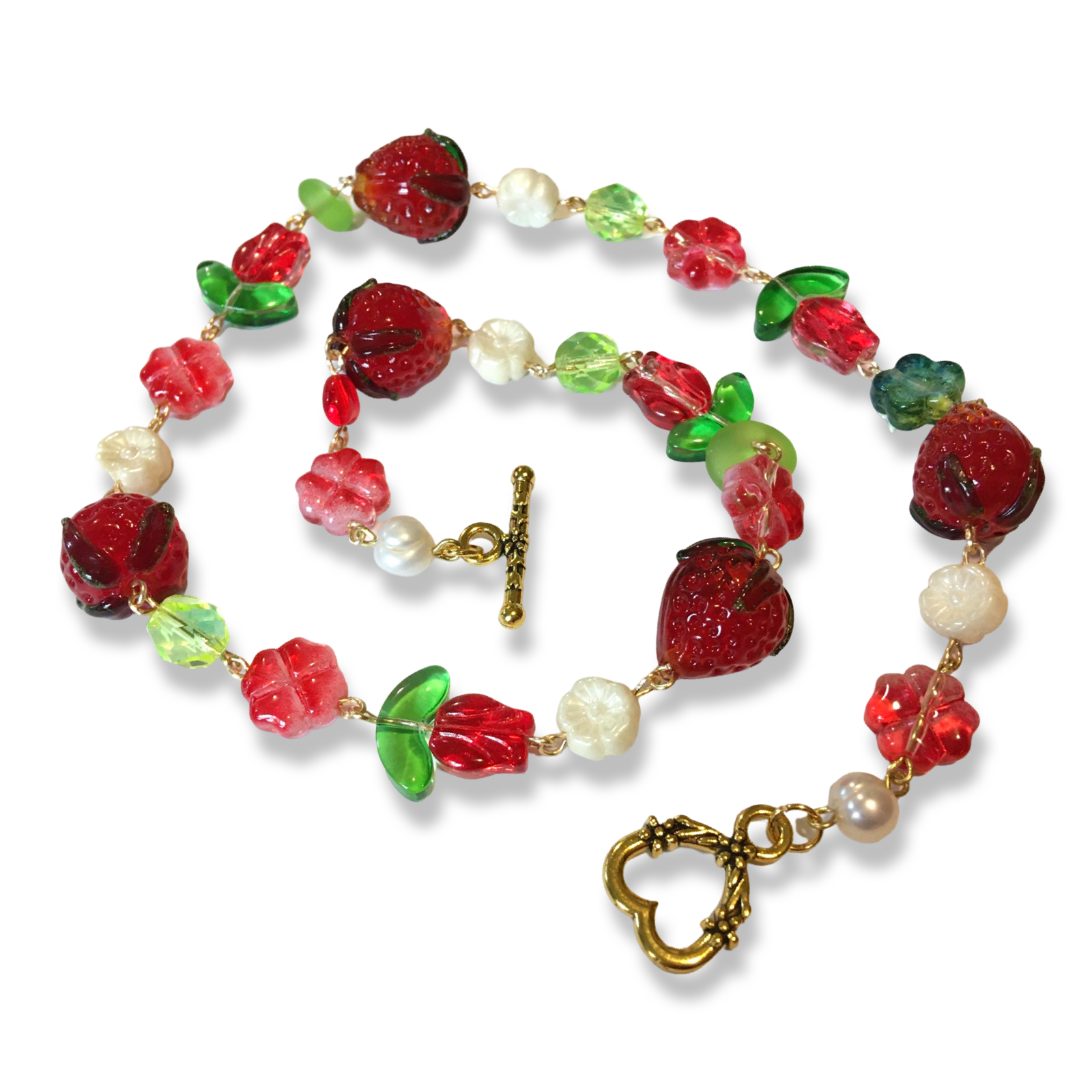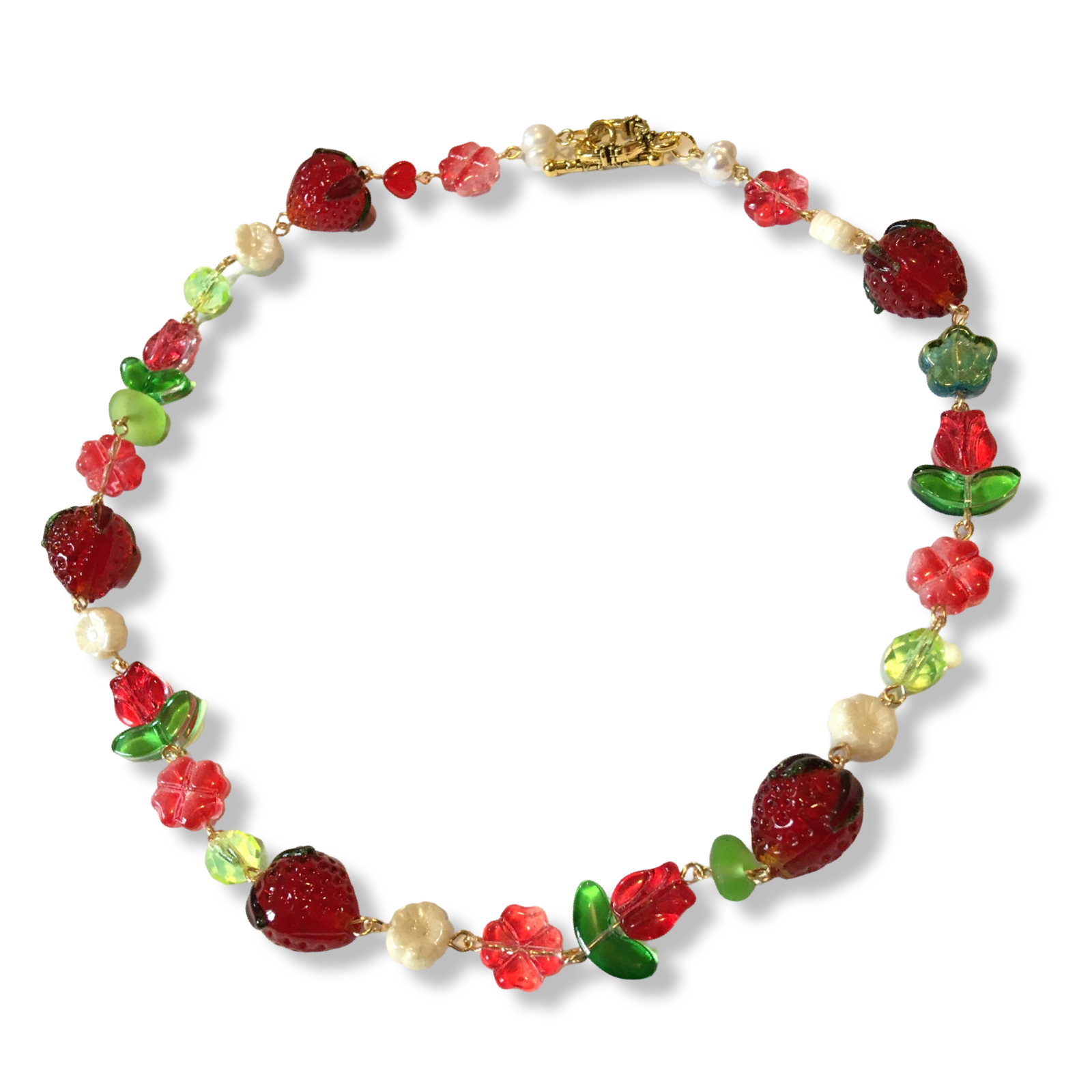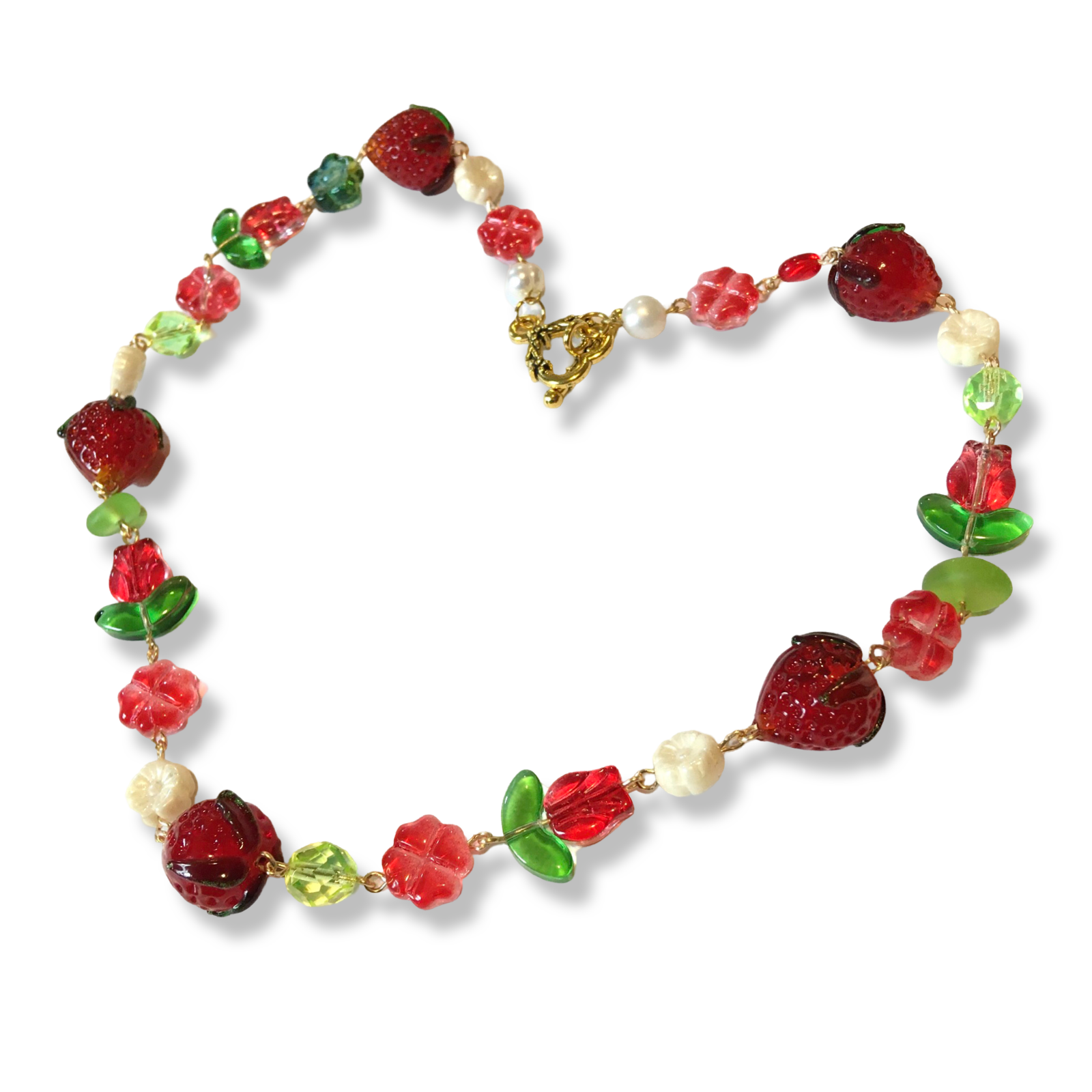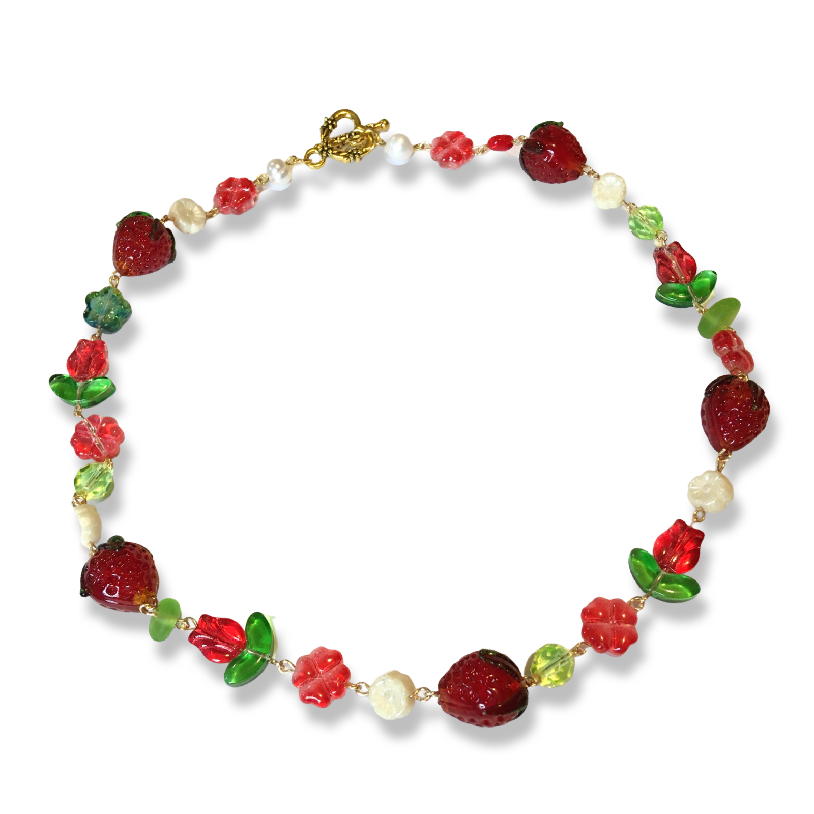 A sweet handmade necklace made with green sea glass, Czech glass beads, and touches of pearl. It features glass strawberries, flowers, clovers, and tulips!