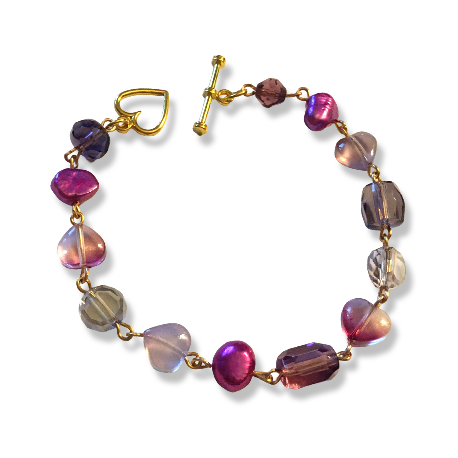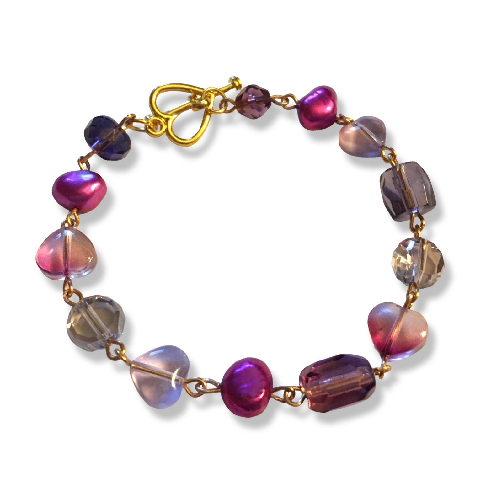 A handmade bracelet in purple and soft maroon, featuring prismatic Czech glass beads, glass hearts, and magenta freshwater pearls.