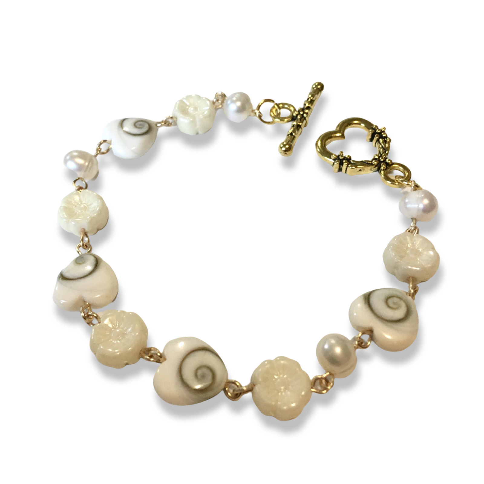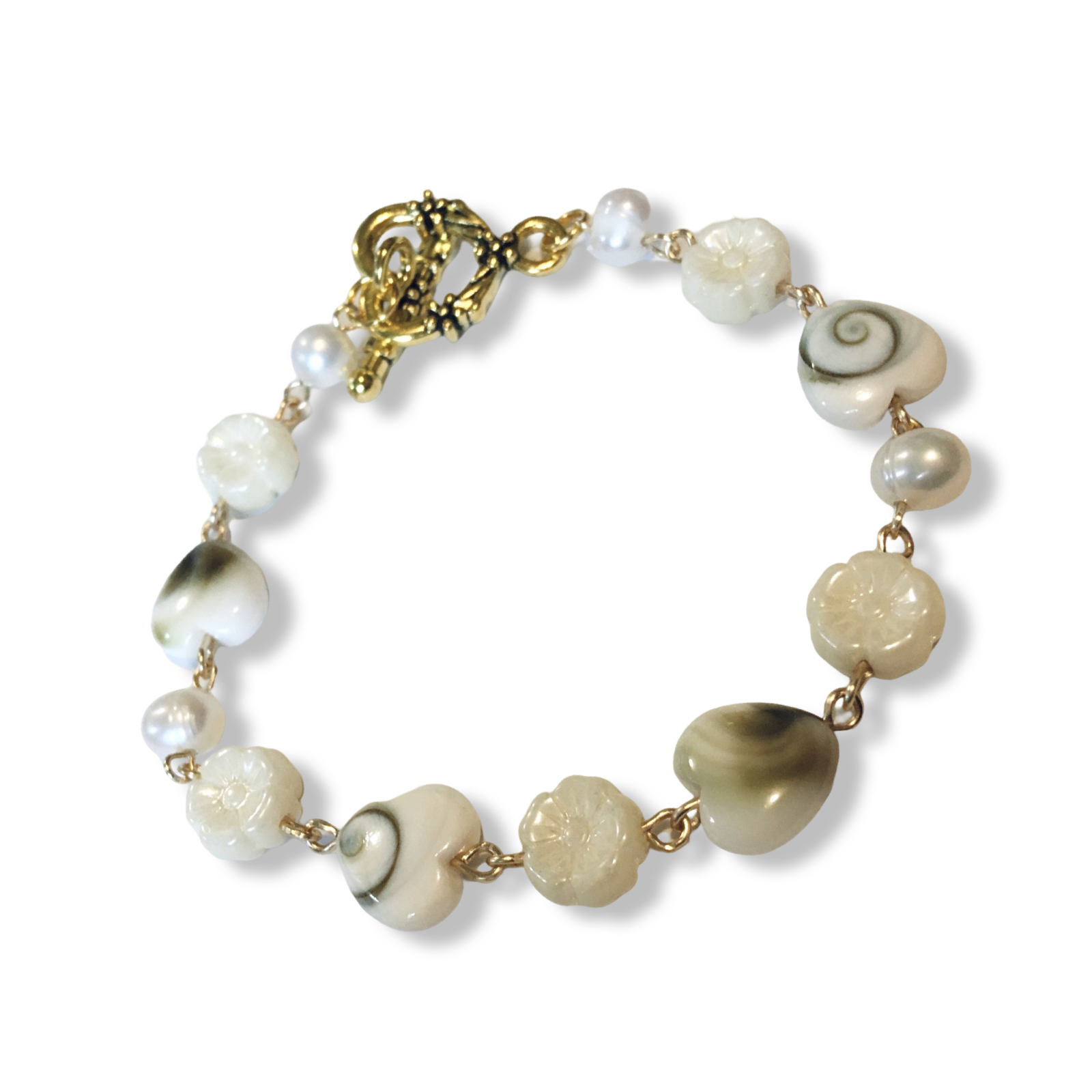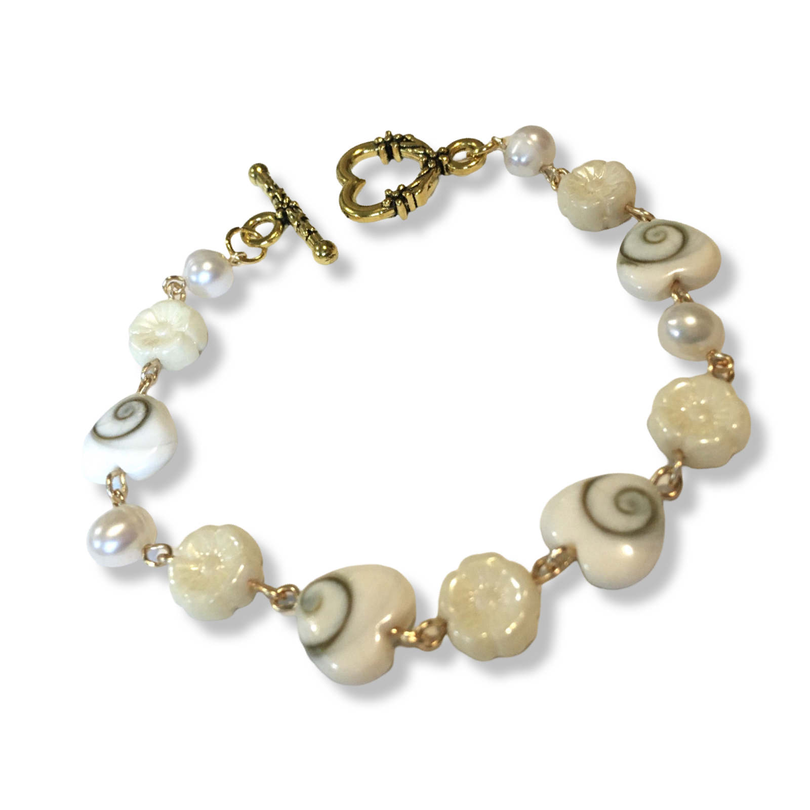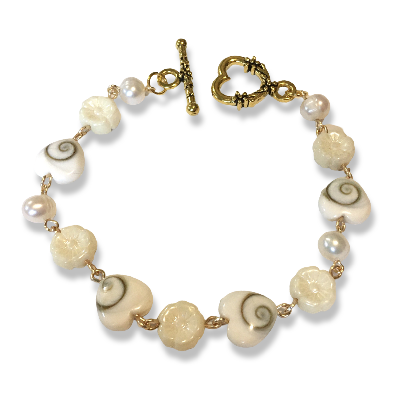 A simple handmade bracelet featuring freshwater pearls, ivory Czech glass flowers, Shiva shell hearts, and an ornate heart clasp.