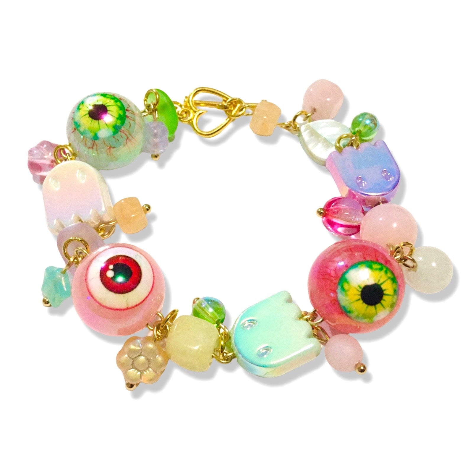 A handmade candy colored bracelet featuring iridescent ghosts and toy eyeballs, seaglass, and assorted beads made from Czech glass, plastics, and semiprecious stones.