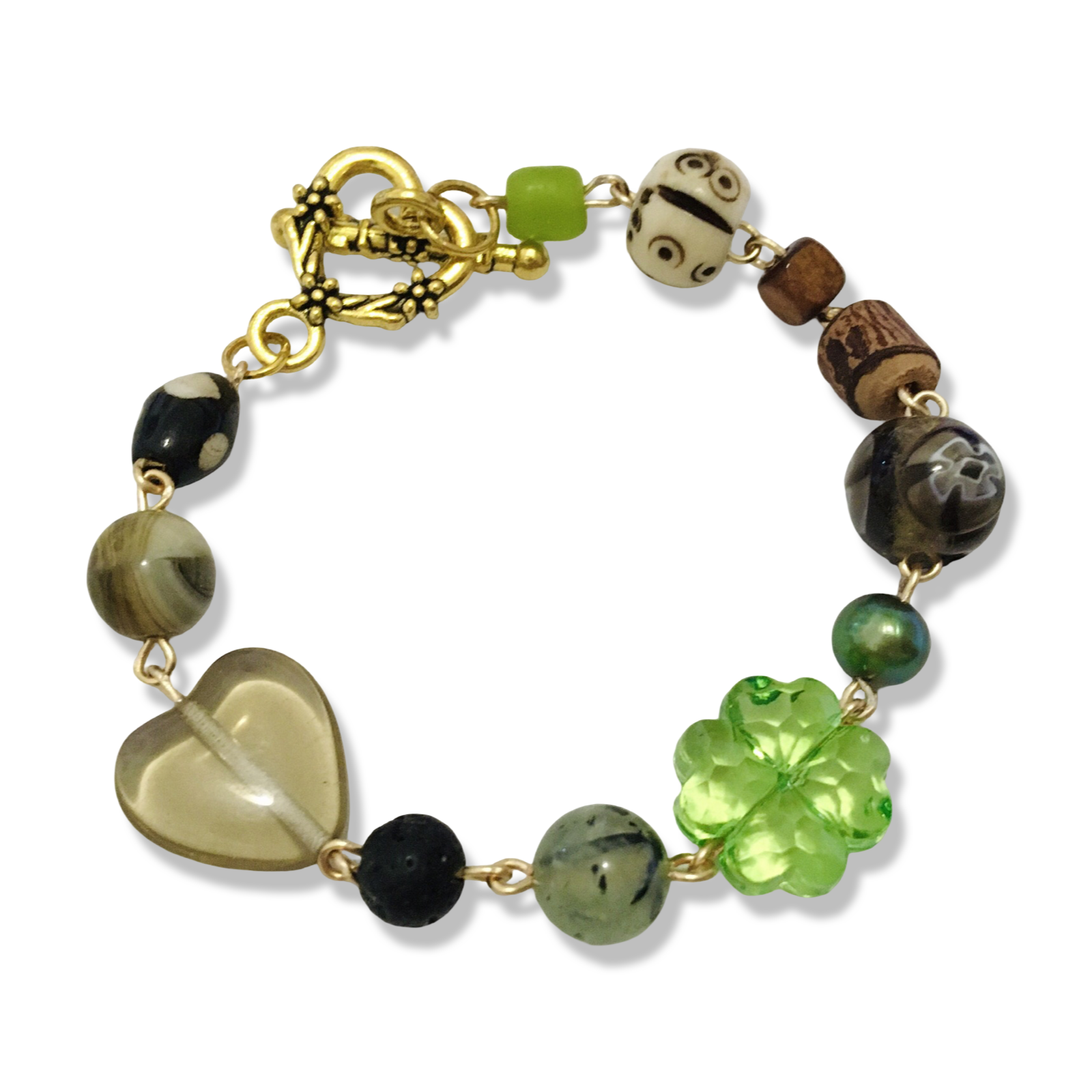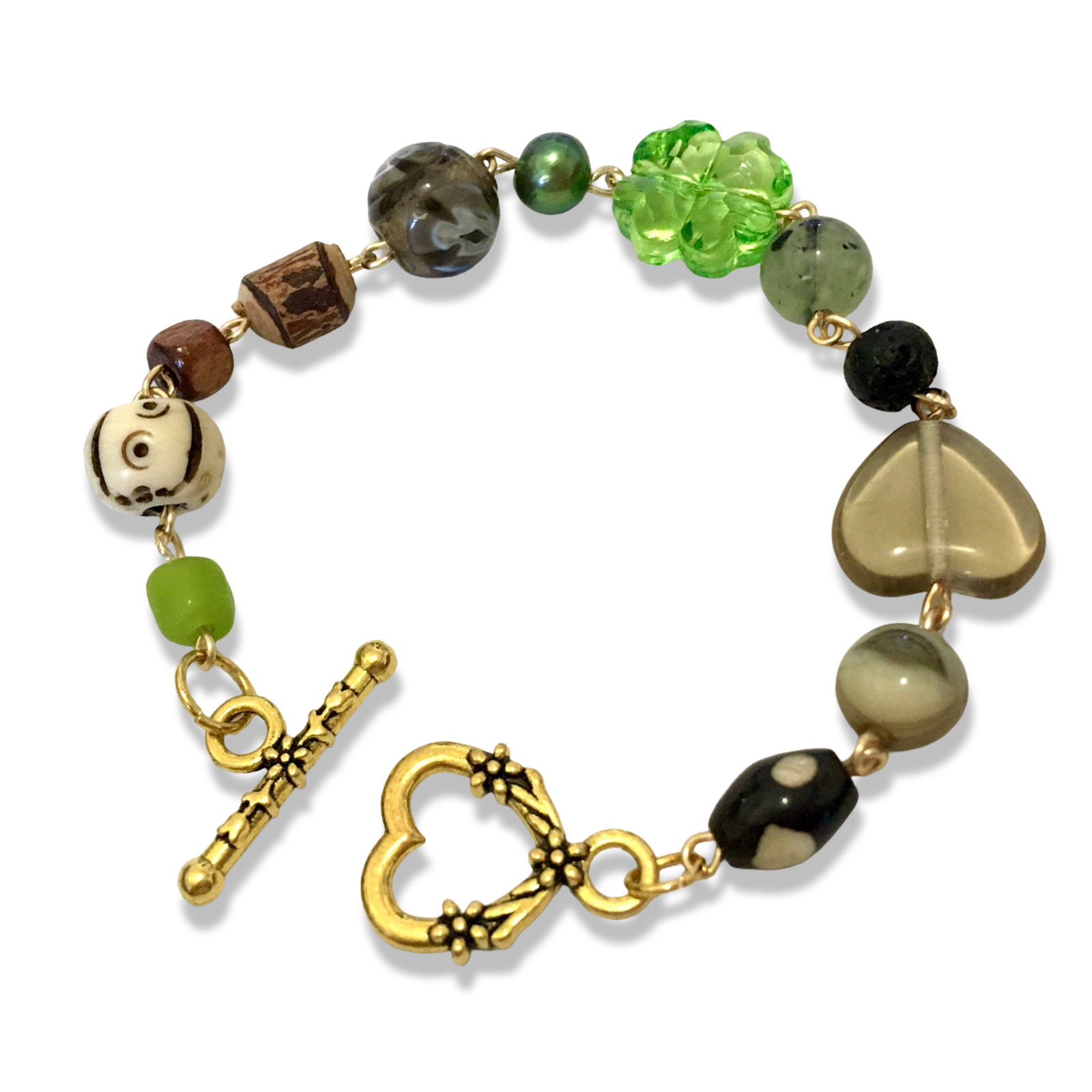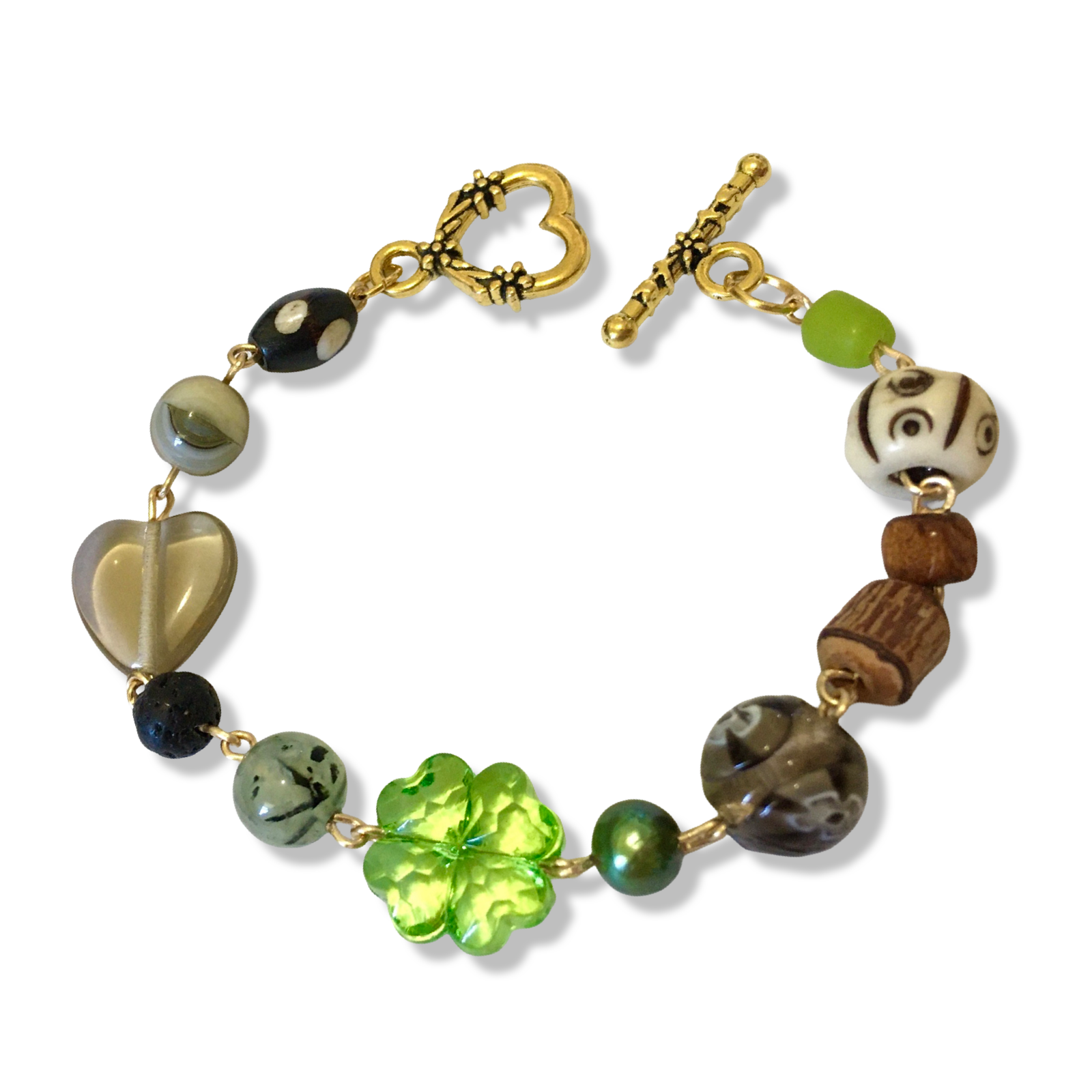 A handmade bracelet featuring two stone beads, two batik bones, two wooden beads, two salvaged glass orbs, one emerald freshwater pearl, one plastic clover, one lava rock orb, and one salvaged glass heart.