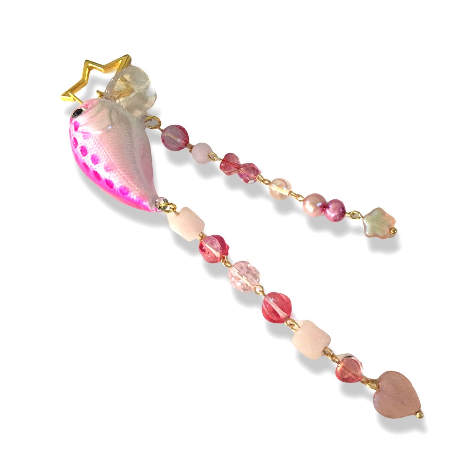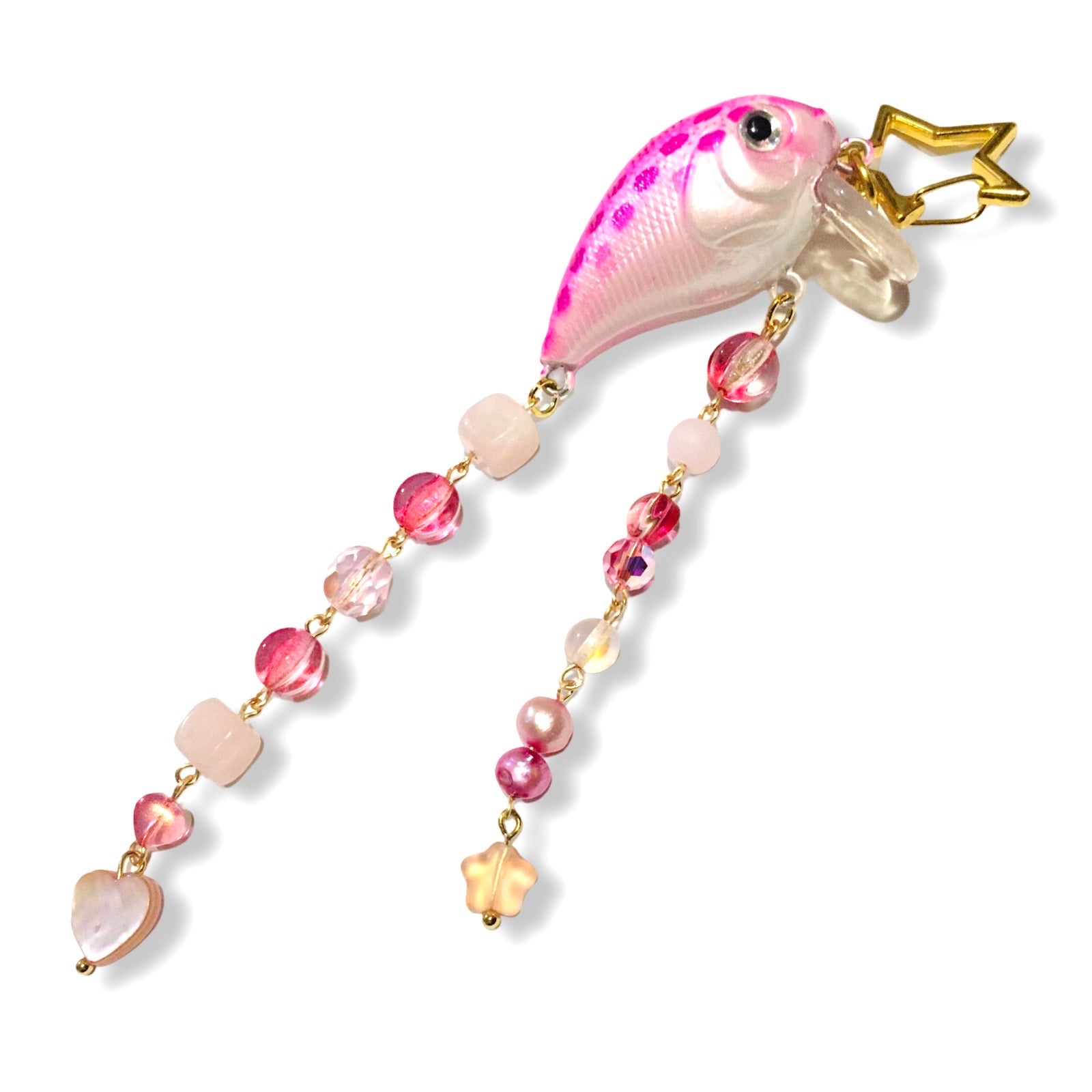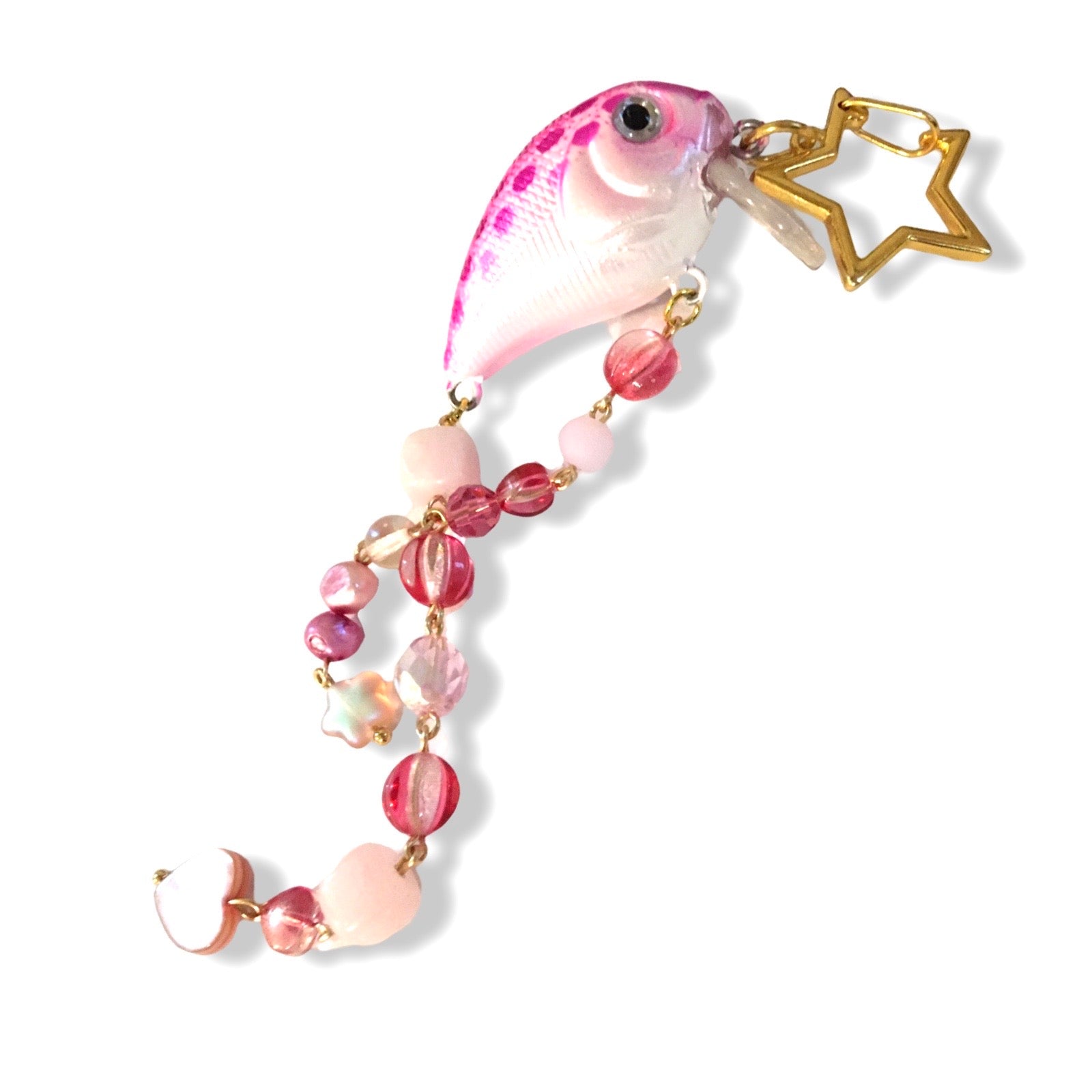 A star-carabiner keychain featuring a polka dotted fishing lure, pink freshwater pearls, and beads made from Czech glass, plastics, shell, and stones. Free US shipping.