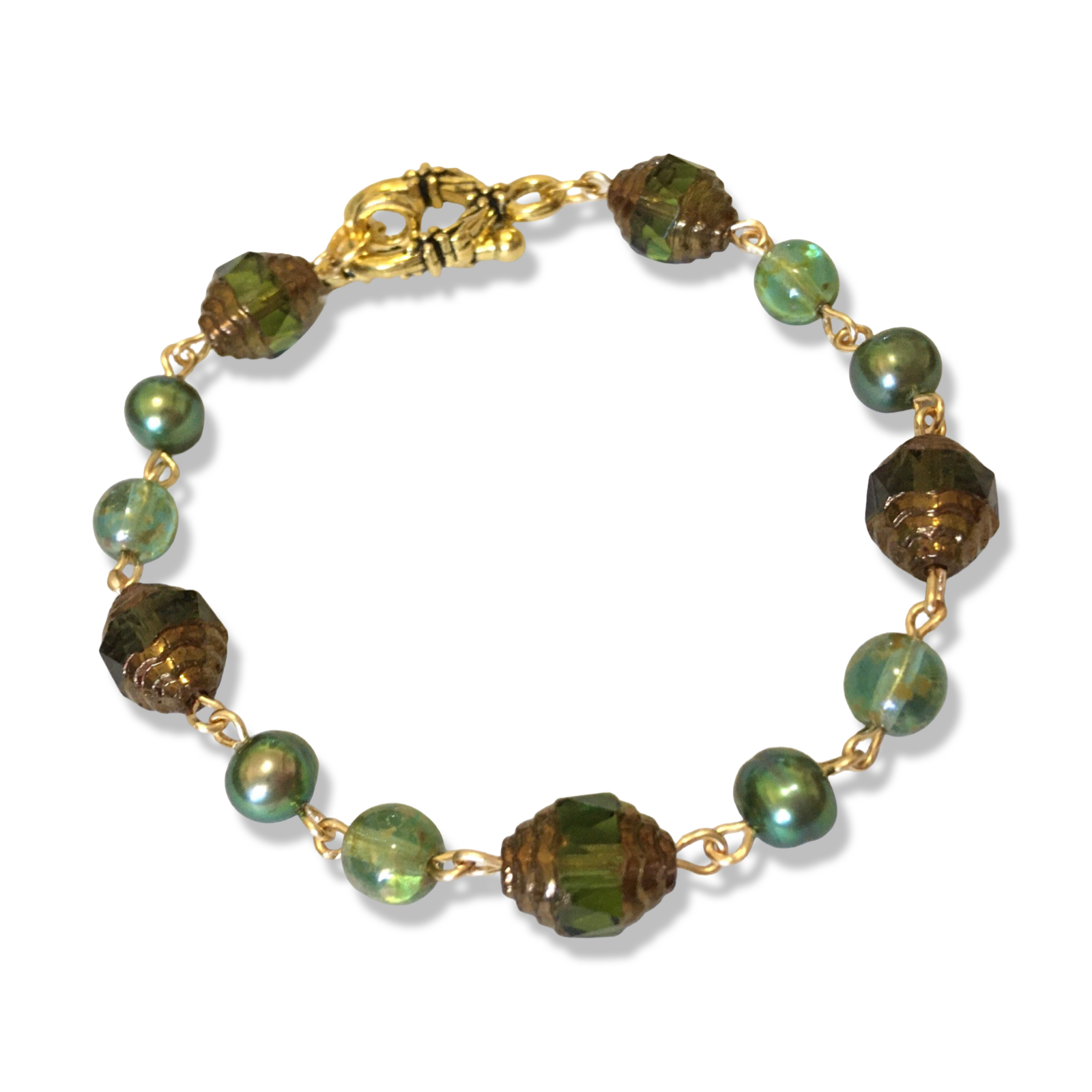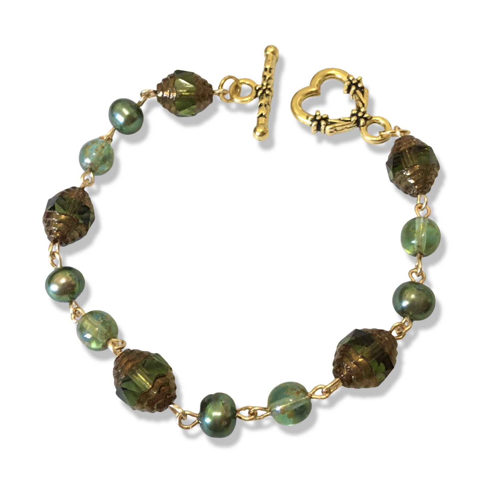 A handmade bracelet featuring freshwater pearls in emerald green and salvaged vintage beads.
