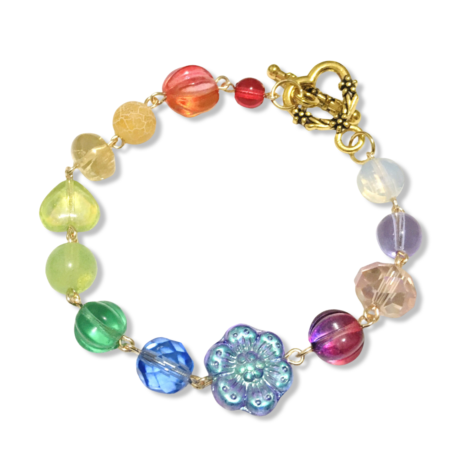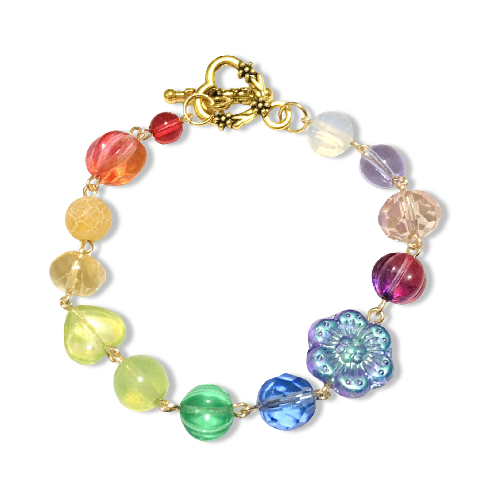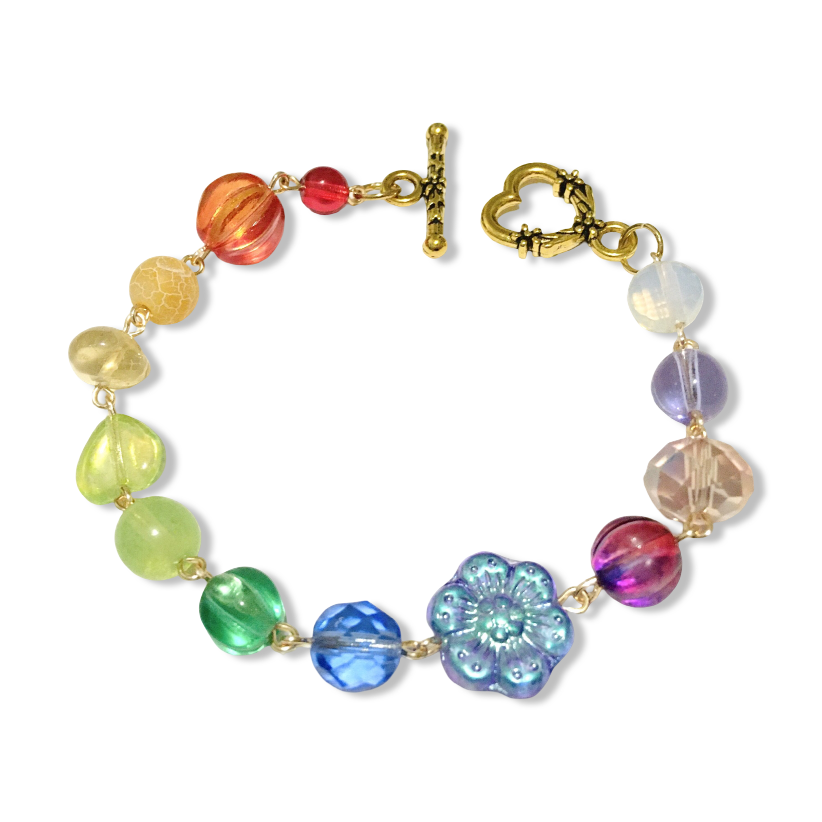 A handmade rainbow bracelet made of glass, with a small touch of agate and citrine.