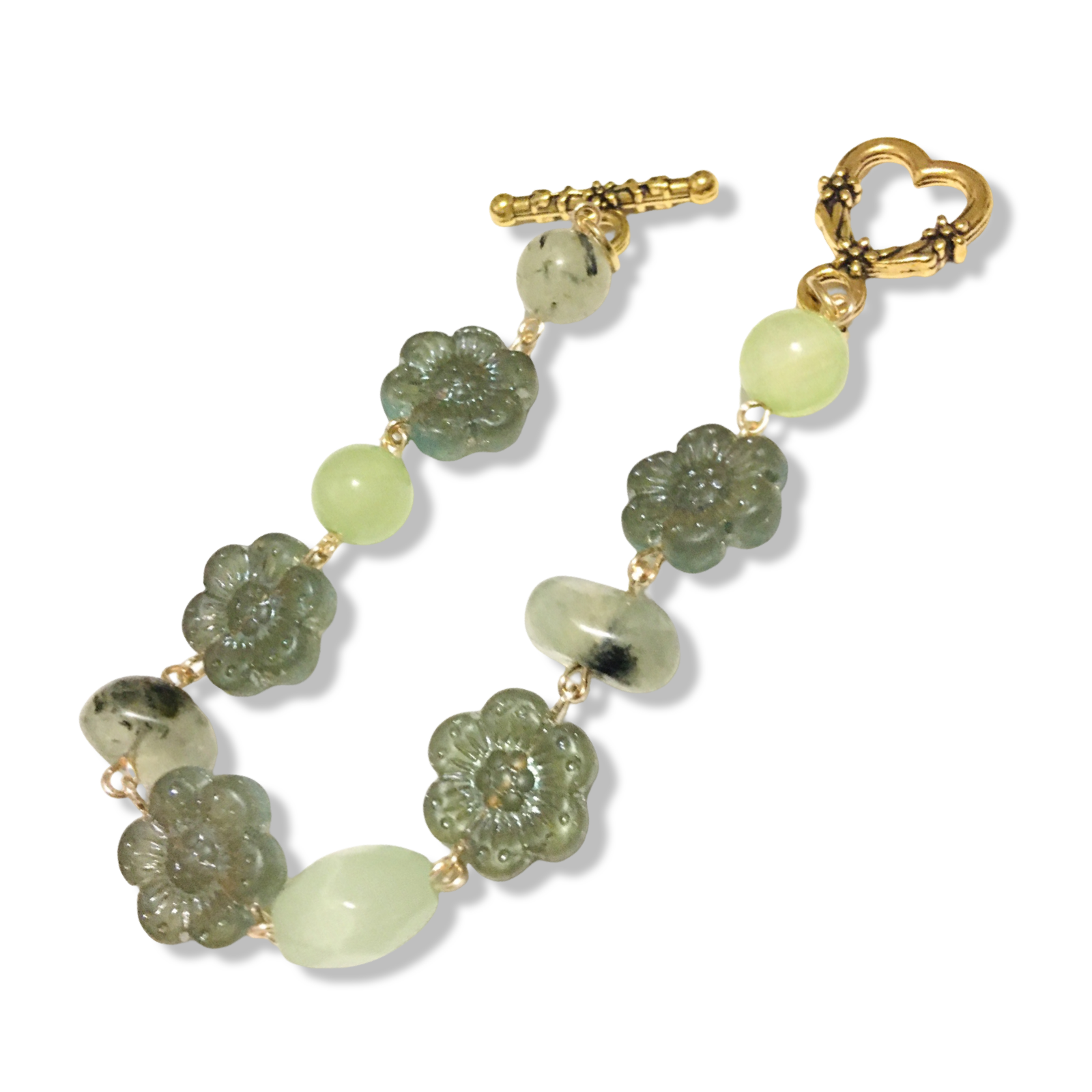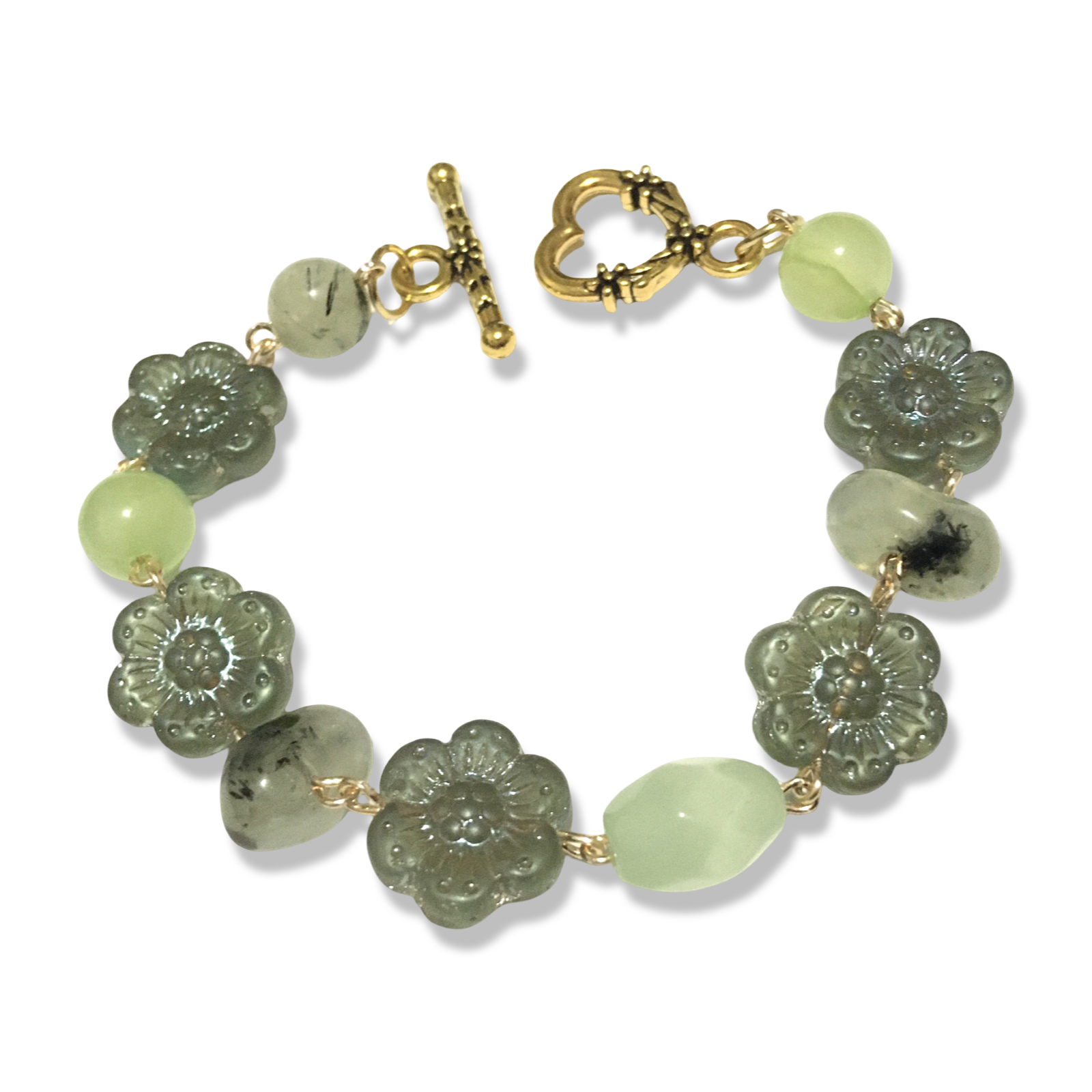 A handmade bracelet in the colors of lichens, featuring sage glass anemones, jade, glass, and tumbled prehnite beads.