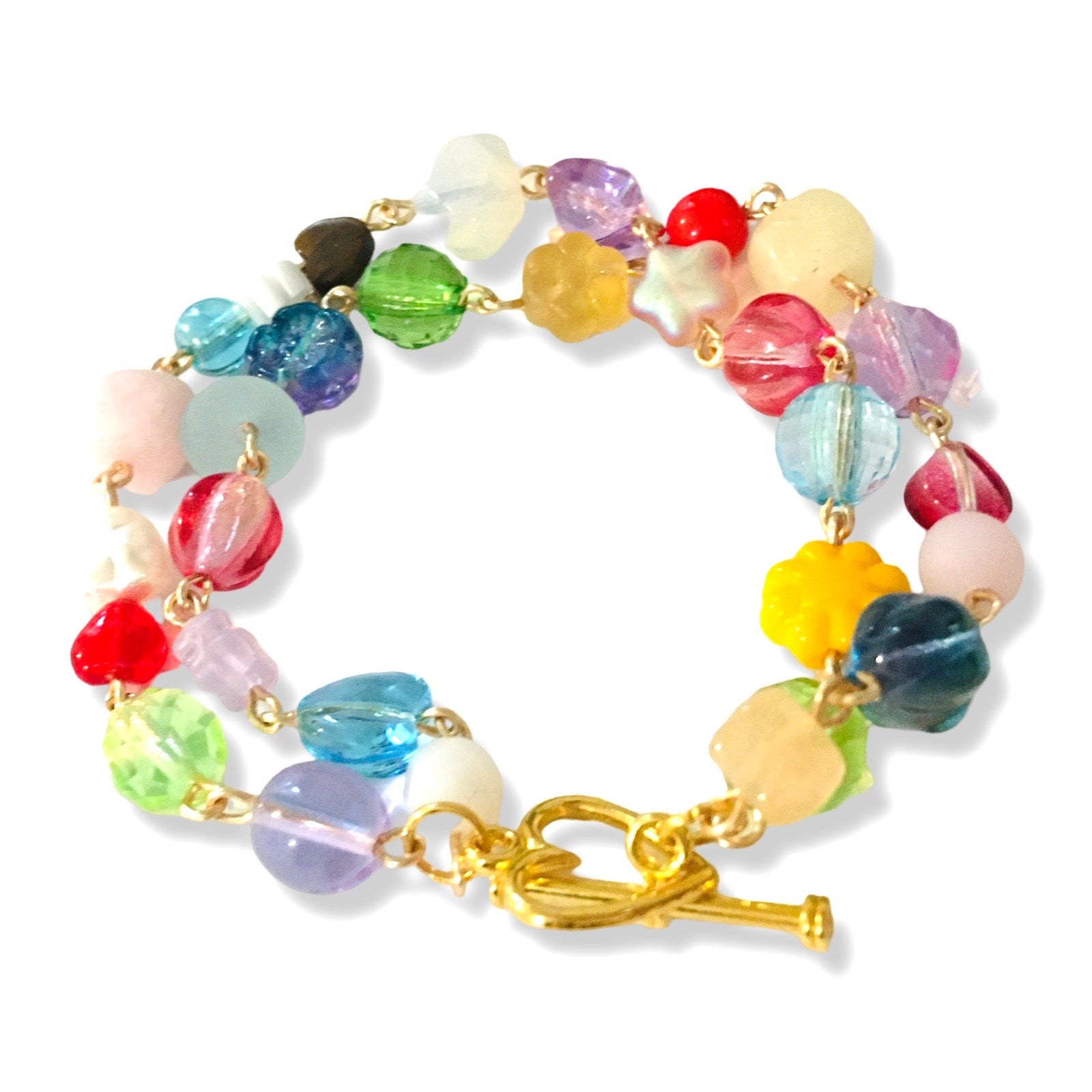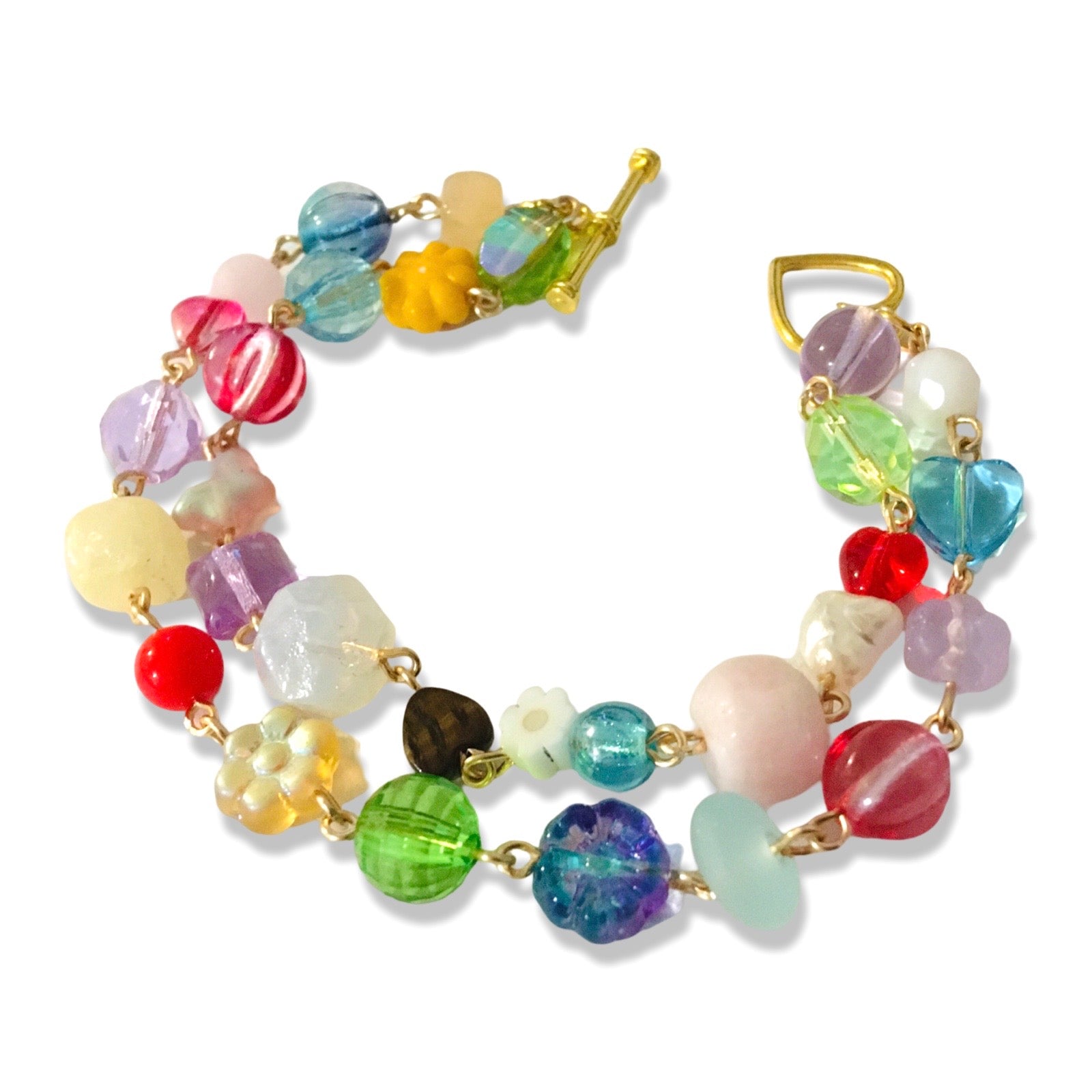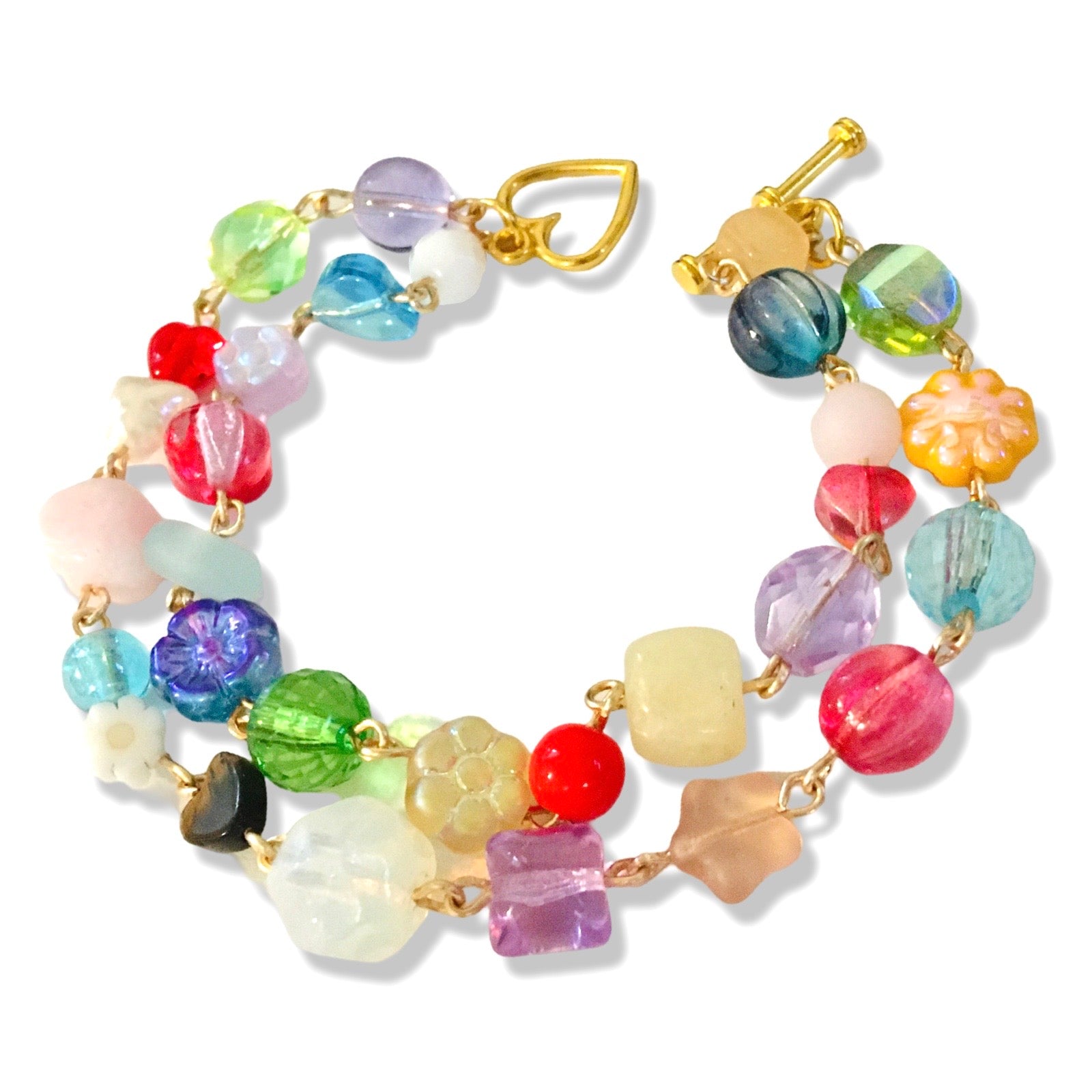 A two-tiered bracelet featuring a big mix of Czech glass, salvaged plastics, and semiprecious stones. Free US shipping!