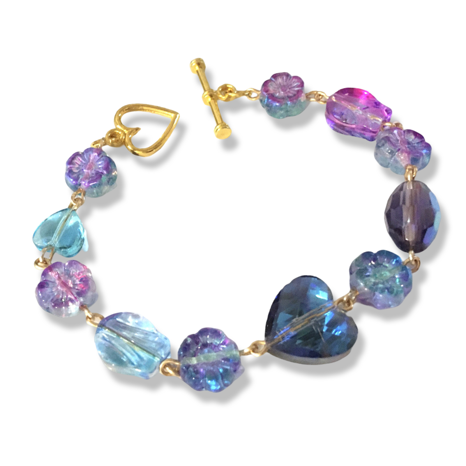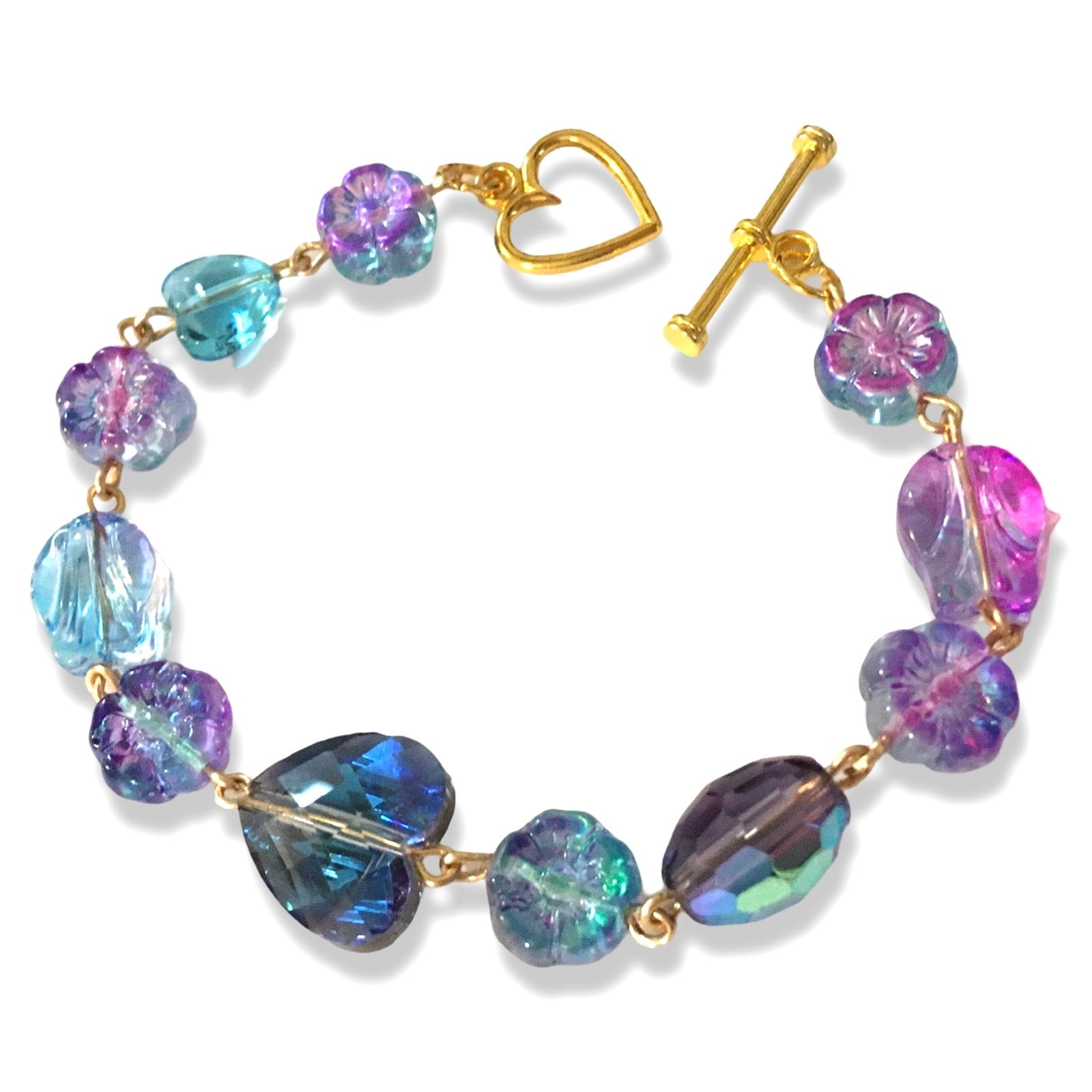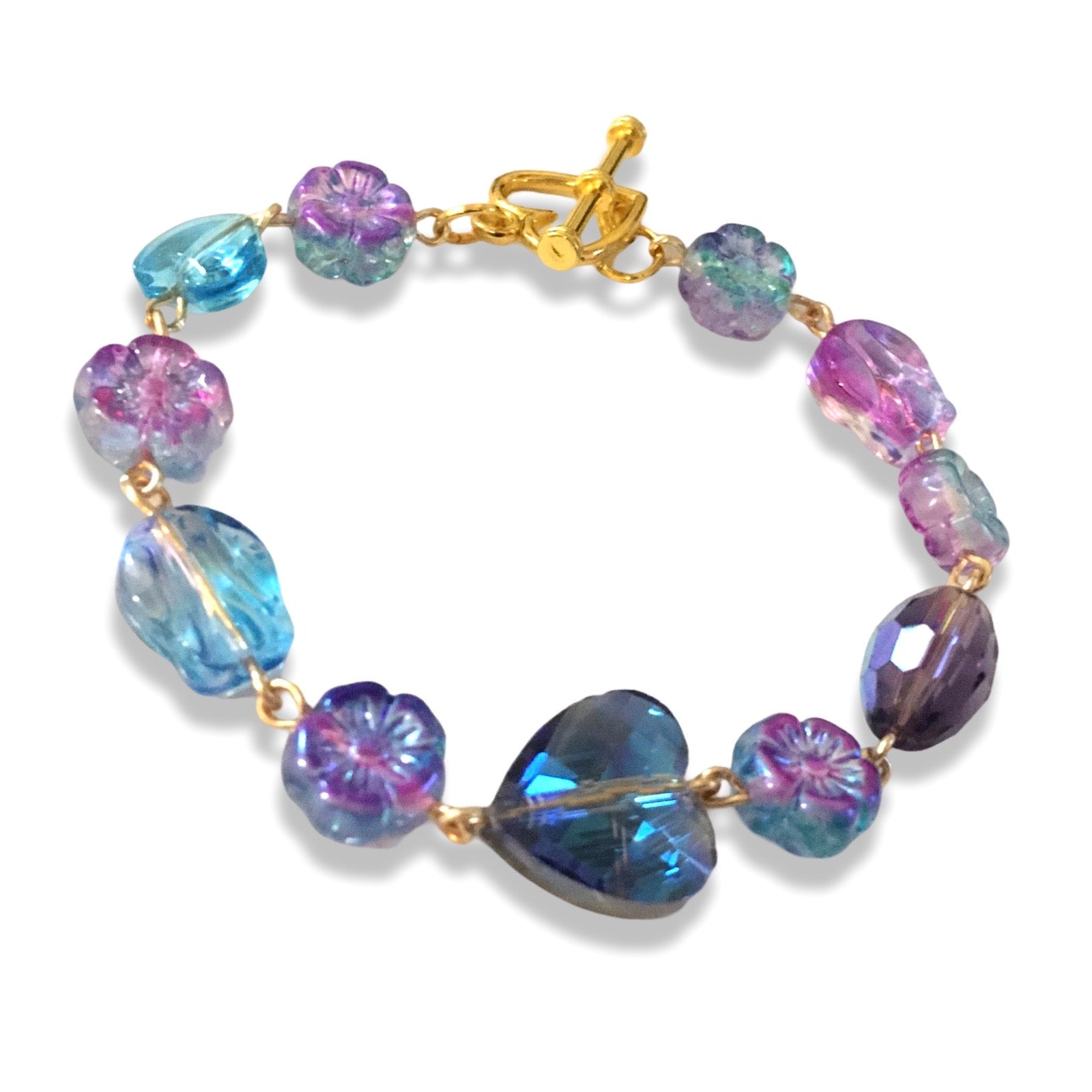 A handmade iridescent bracelet featuring Czech glass hearts and flowers with a beautiful iris luster. Free US shipping!